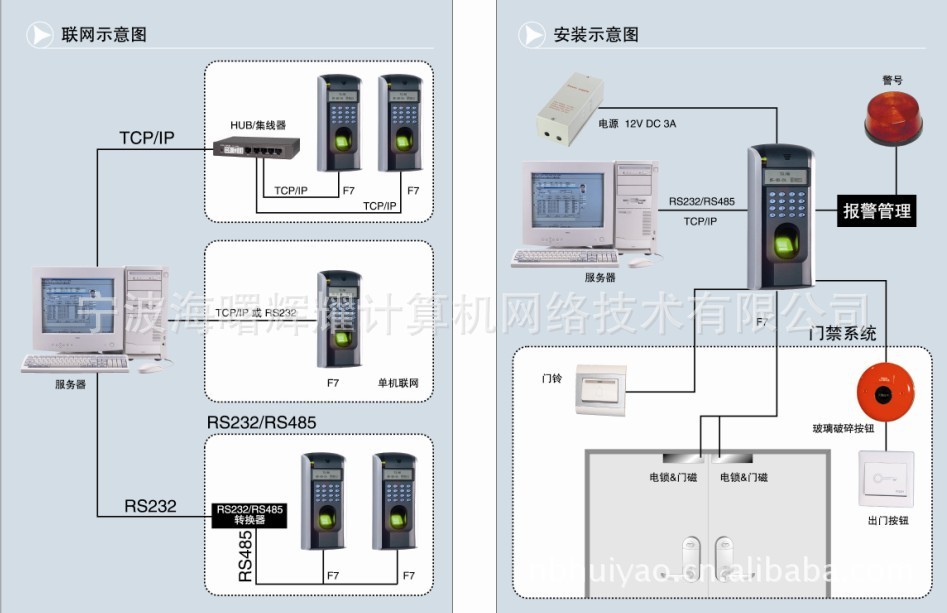 F7普及版支持RS485/RS232通讯.无须连接电脑,单机独立工作。支持门禁功能(不同时间段开门,多人开门,拆机报警,门未关好报警,门被非法打开报警,开门按钮输入,有线门铃接口,一路警报输出)。