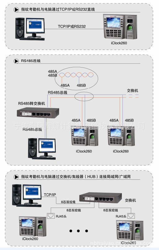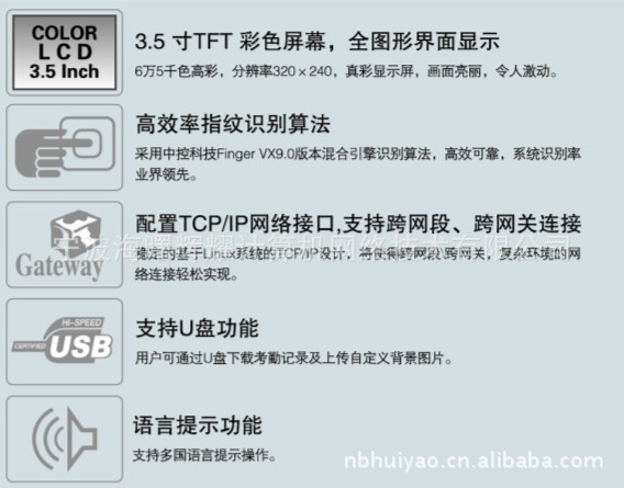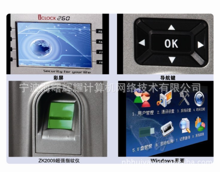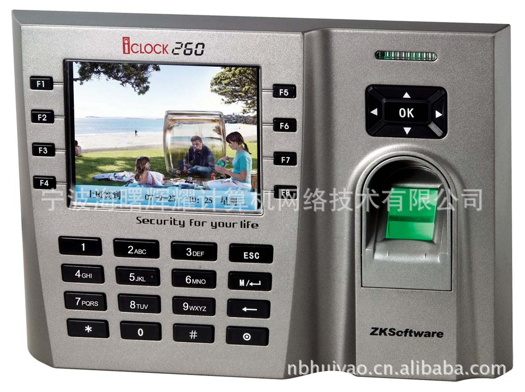 iClock260支持T9输入法,可以直接通过机器键盘输入汉字,内置Linux操作系统,欧洲顶尖的专业化技术,机器可以长期高效的运行。采用了人性化的界面设计风格,全图形界面显示,使人机间更加直观友好交互。3.5寸TFT彩色屏幕,6万5千色高彩,分辨率320X240,尖端的处理技术,让你拥有宽视域的视觉享受。是专门针对需要远距离脱机使用的企事业单位进行指纹考勤而设计的。指纹考勤机通过RS232、RS485、TCP/IP方式与计算机通讯,可多台联网使用;识别率高,解决特殊人群指纹质量比较差的问题,适合100-500人的考勤管理。