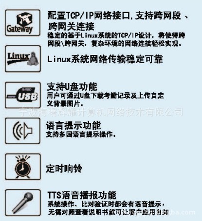 ??? 标准的TCP/IP接口支持跨网段连接,可与您的应用环境无缝连接,助您实现分布式广域网人力资源管理。基于Linux系统的设备均有合法授权唯一的MAC地址,即使是极端复杂的网络环境也可轻松融入。