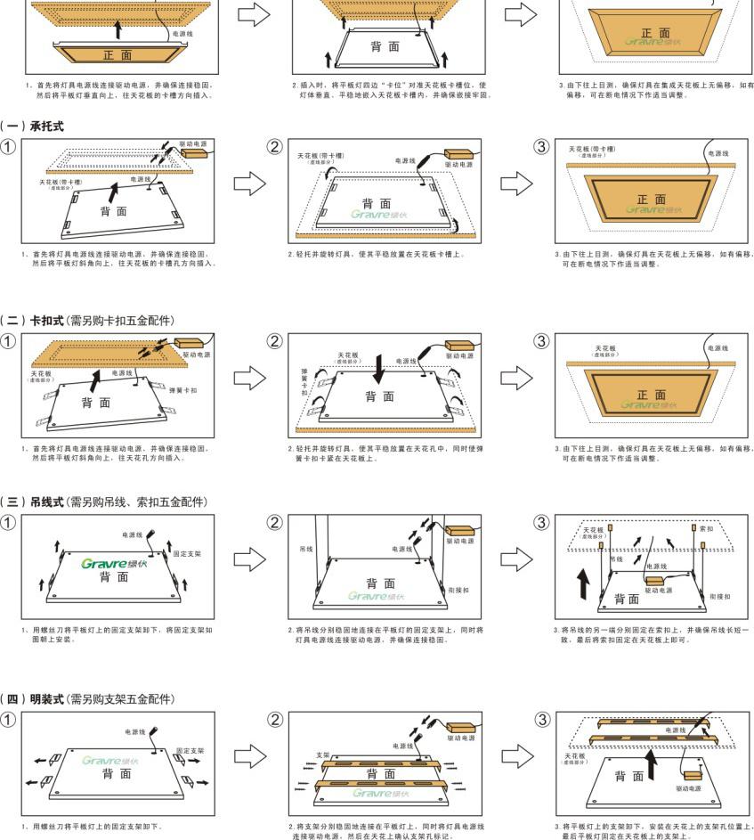 嵌入式、悬吊式、吸顶式、集成吊顶灯