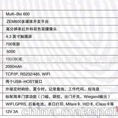 该产品采用了中控科技最新的ZEM600核心板,ZKFinger10.0指纹面部混合识别算法,容量大,识别速度快,集成高分辨率夜视红外和彩色双摄像头功能,适用范围广,不受外界光线的影响,无论是在强光下还是在黑暗中也能进行有效识别。该系列已经通过了超过10万面部数据库长达2年的测试,同时该算法也在美国San Jose大学年度测试中名列前矛,在用户舒适度方面获得了最佳评分。iFace采用了嵌入式中控Multi-Bio CPU,主频为630MHZ,可以处理高达1:20000的1:N速度,符合人体工程学的外观设计,工业设计由德国专业公司主导完成,模具采用了PC材料+蚀纹工艺+镜面工艺,采集比对就如照镜子一般,支持4.3寸全触摸TFT,仅有6个状态功能键,其它按键在TFT上全触摸操作。标配TCP/IP通讯方式,支持跨网段跨网关连接。