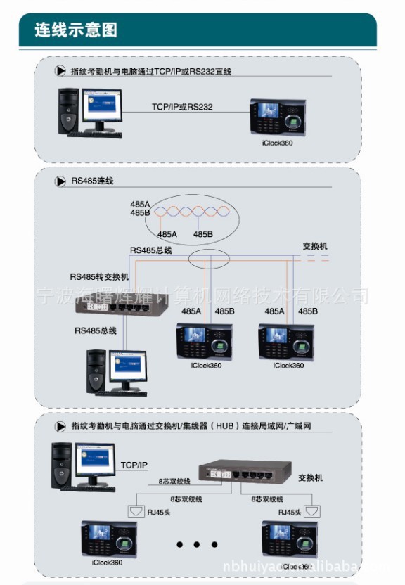 iClock360支持T9输入法,可以直接通过机器键盘输入汉字,支持U盘上传下载考勤记录的功能,是专门针对需要运距离脱机使用的企事业单位进行指纹考勤而设计的。采用了人性化的界面设计风格,全图形界面显示,使人机间更加直观友好交互。3.5寸6万5千色高清TFT彩屏,分辨率320X240,尖端的处理技术,让你拥有宽视域的视觉享受。内置Linux操作系统,欧洲顶尖的专业化技术,机器可以长期高效的运行。指纹考勤机通过RS232、RS485、TCP/IP方式与计算机通讯,可多台联网使用;识别率高,解决特殊人群指纹质量比较差的问题,适合100-500人的考勤管理。