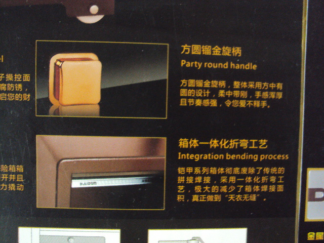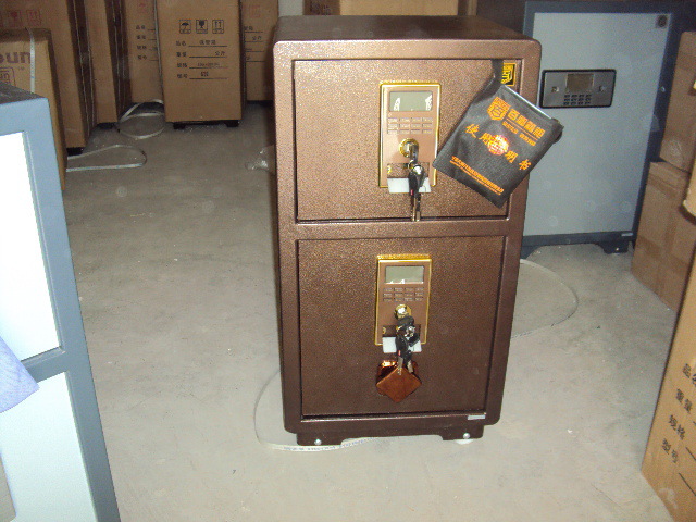 特点:1柜门采用四面叉关用铁棍劲门面不得开启达到国家标准GB10409-2001中A级标准要求。2柜体采用高厚度钢板采用冷轧板工艺一次成型具有焊点少,外表光滑的特性。3选用优质冷轧钢板具有高效的隔热夹层,同时具备抵御各种钻割工具破坏的性能。4一流选装起保险分体式密码锁防钻弹了门锁,门与箱体之间没有独特合理的全方位插销机构。5配有先进的防敲击倾斜内部报警设置。