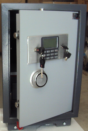 特点:1柜门采用四面叉关用铁棍劲门面不得开启达到国家标准GB10409-2001中A级标准要求。2柜体采用高厚度钢板采用冷轧板工艺一次成型具有焊点少,外表光滑的特性。3选用优质冷轧钢板具有高效的隔热夹层,同时具备抵御各种钻割工具破坏的性能。4一流选装起保险分体式密码锁防钻弹了门锁,门与箱体之间没有独特合理的全方位插销机构。5配有先进的防敲击倾斜内部报警设置。