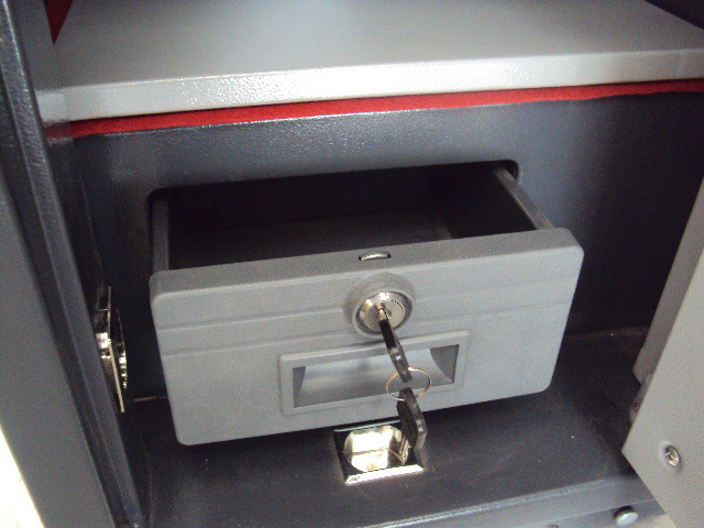 电子保险箱的应急开启方法:当输入密码不正确时将右边的钥匙打开,插入钥匙转动钥匙此时与主钥匙同时打开。