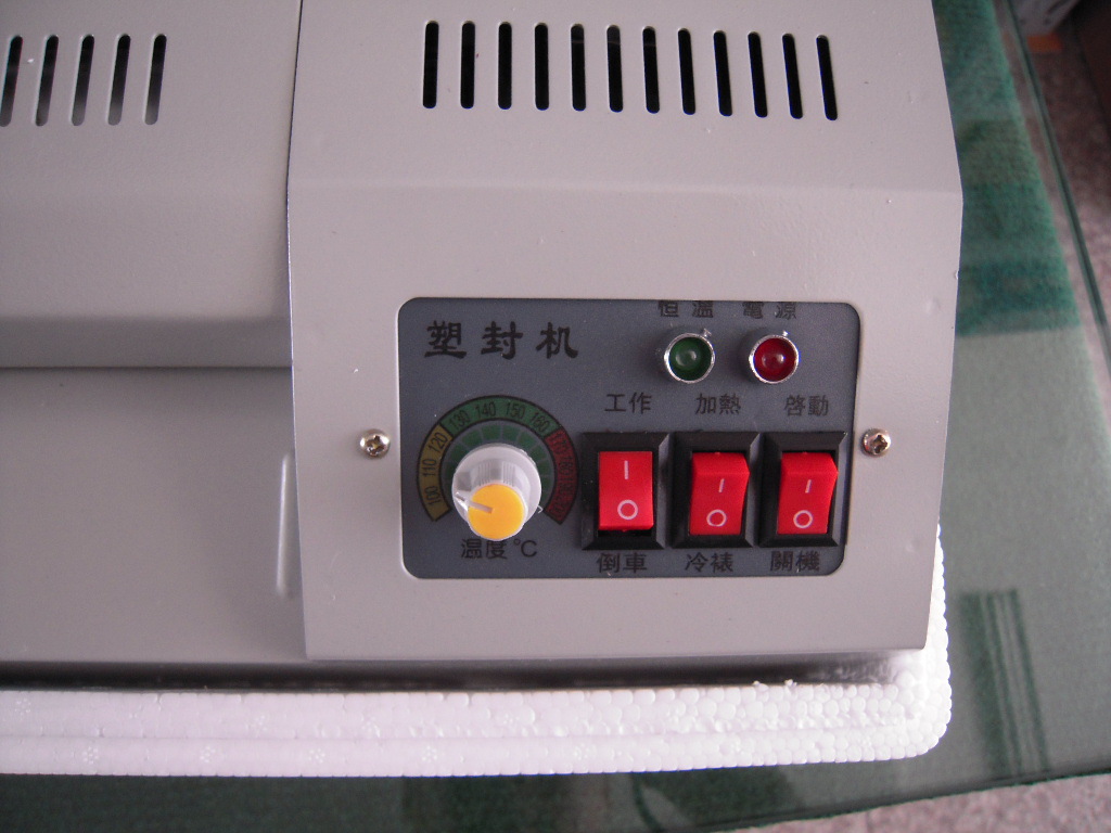 本机由电源开关、工作倒车开关、加热开关、电源指示灯,和恒温指示灯,温度设定旋钮。电子控温,胶辊传热、国产进口卡片均可使用,温度可调,有倒车功能及冷裱作用。