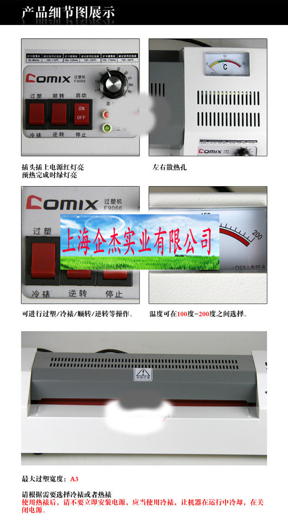 1、全金属结构,具有三档调温功能和手动进退功能,A3超宽过塑幅面