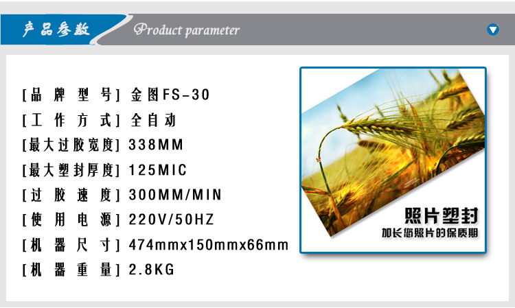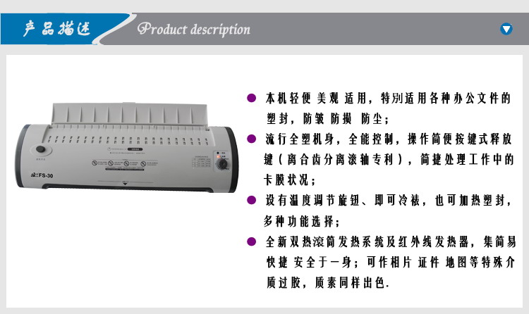 ◆ 本机轻便 美观 适用,特別适用各种办公文件的塑封,防皱 防损 防尘;