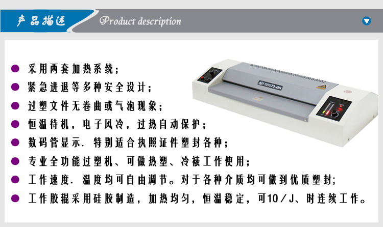 ◆ 专业全功能过塑机.可做热塑.冷裱工作使用;数码管显示.特别适合执照证件塑封各种;