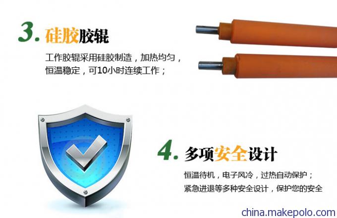 工作胶辊采用硅胶制造,加热均匀,恒温稳定,可10/J、时连续工作;