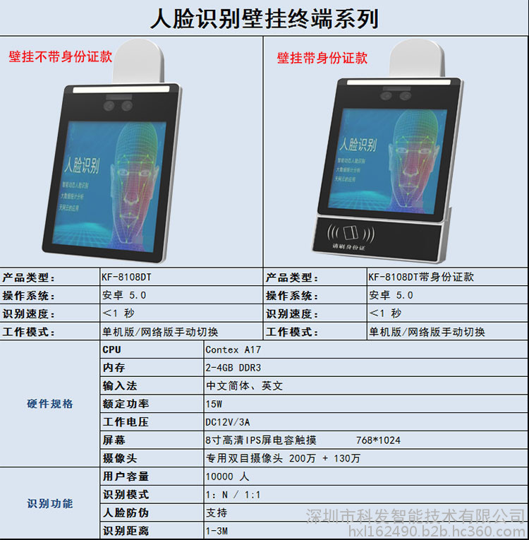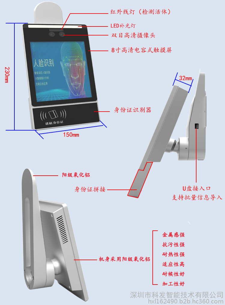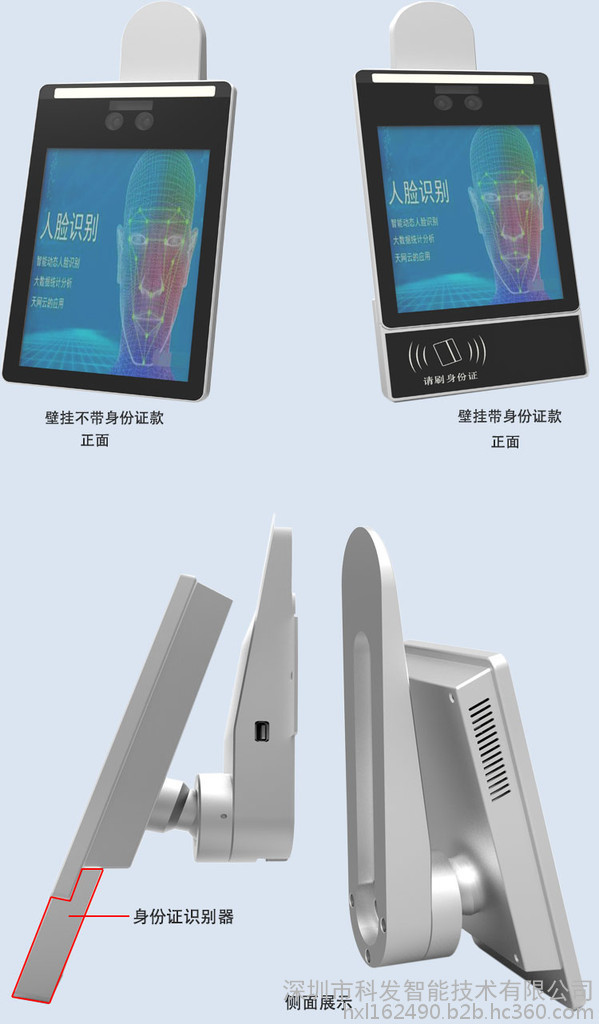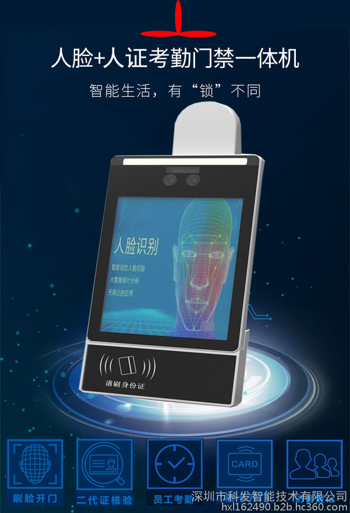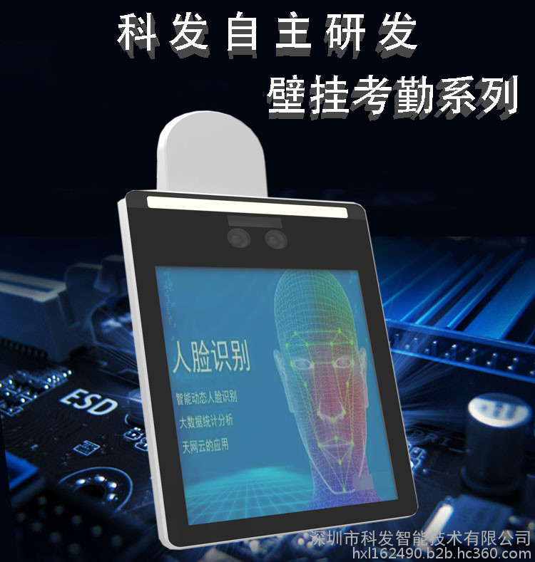 壁挂考勤机:采用8寸高清触摸电容屏,高像素双目摄像头支持活体检测功能,多种识别模式:人脸+身份验证 人脸+RFID卡验证人脸智能验证 多种模式识别,适合不同场所,不同识别要求认证,