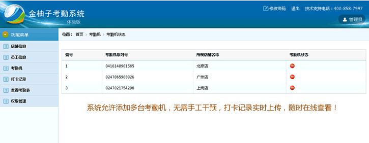 ◆考 勤 机:查看店铺考勤机列表及连接状态。