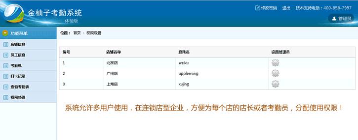 ◆权限管理:可以根据实际需要对店铺进行权限的设置,可设置店铺登陆账号和密码。