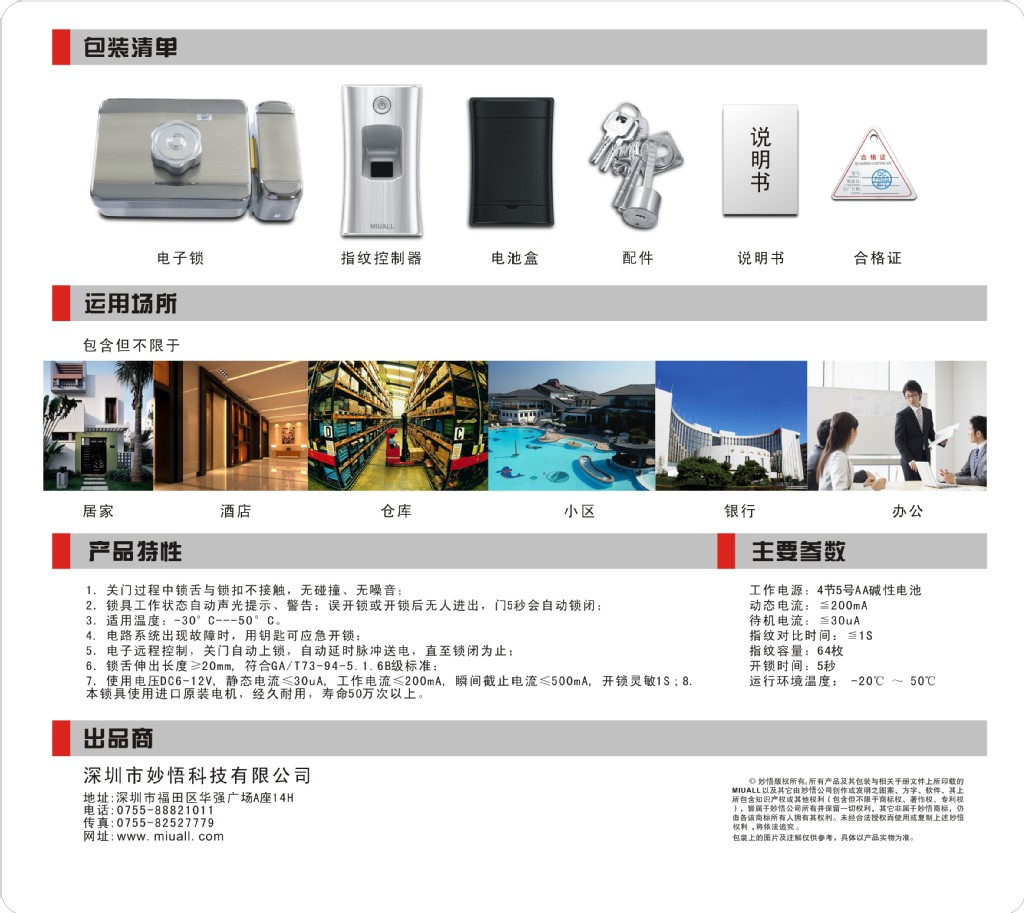 指纹机械**技术汇聚一身,彰显您豪宅的尊贵!由**业界的指纹技术与数码遥控技术的**结合,以**不锈钢材打造的锁具主要部件,为您提供的是一款安全,实用、稳定,方便的高科技产品,在每一个细节尽显妙悟人对您的关怀,给您更加贴心的感受!是智能家居**楼宇、别墅豪宅、企事业机关、金融、**、办公场所等的**配套门锁