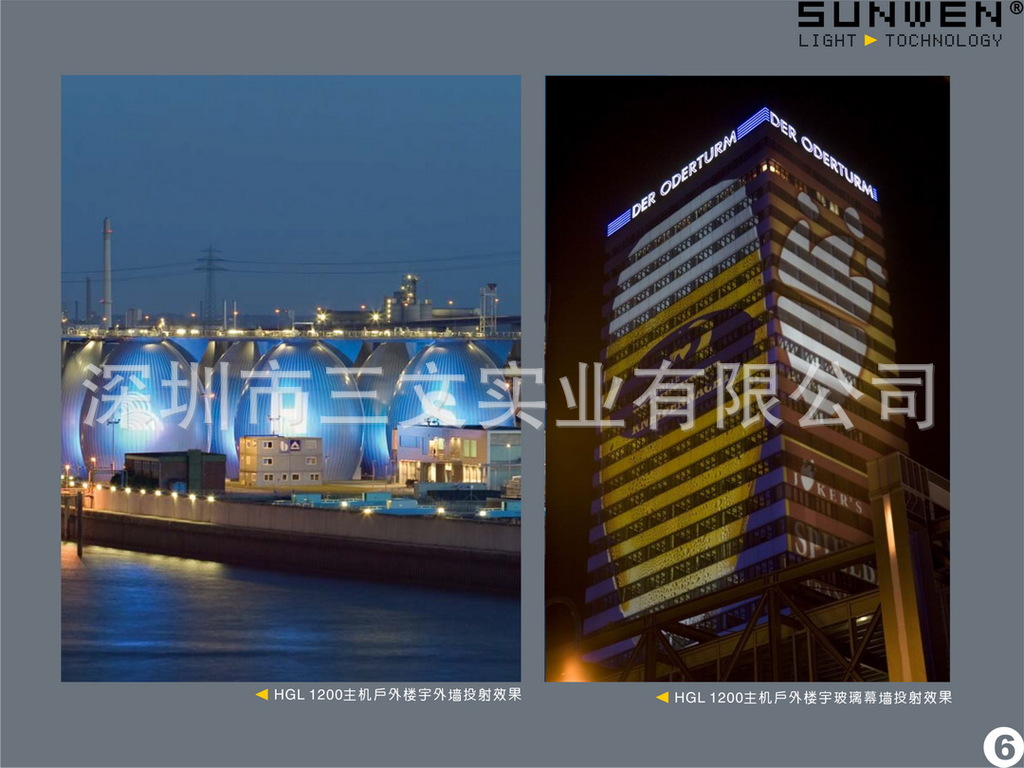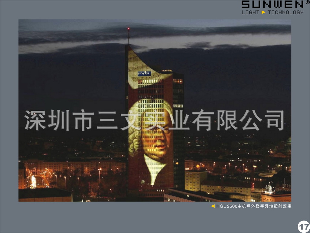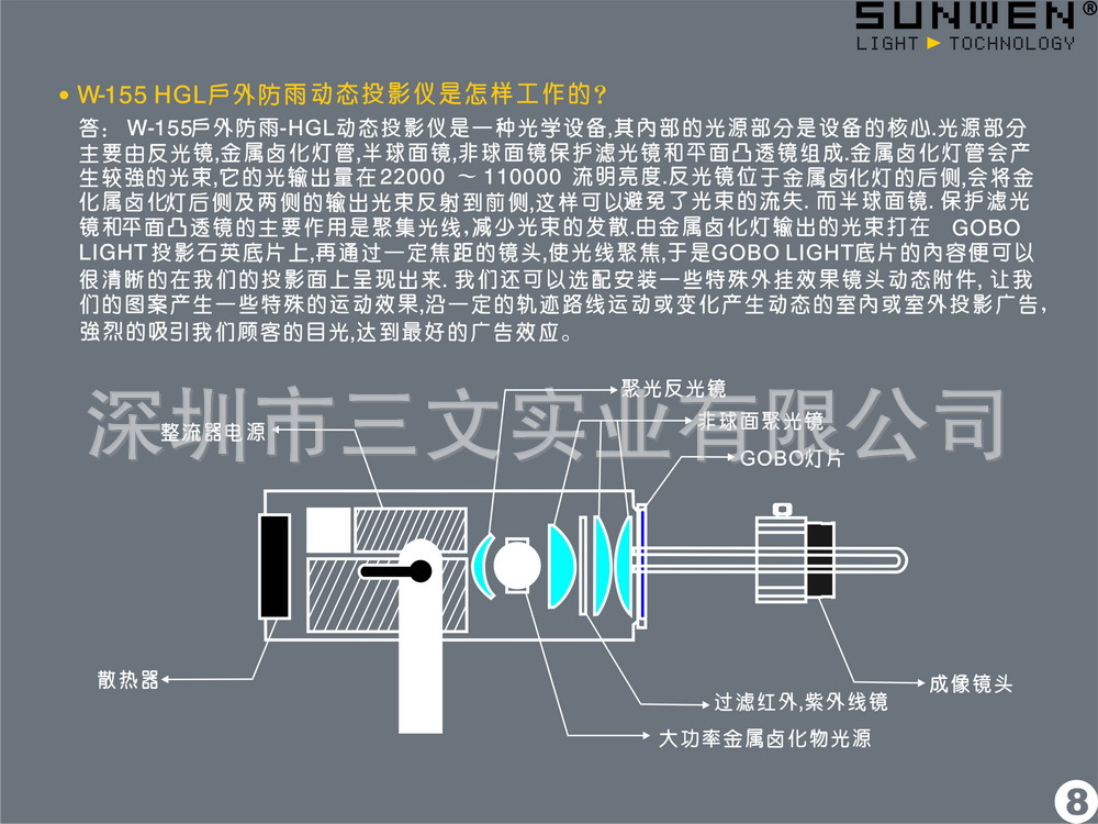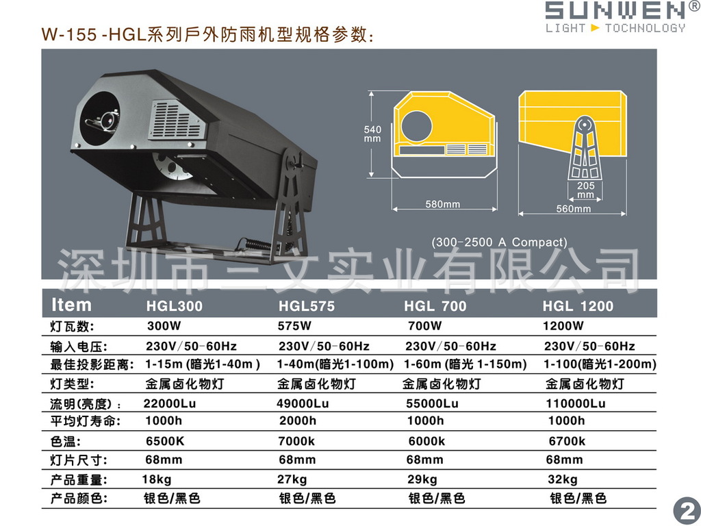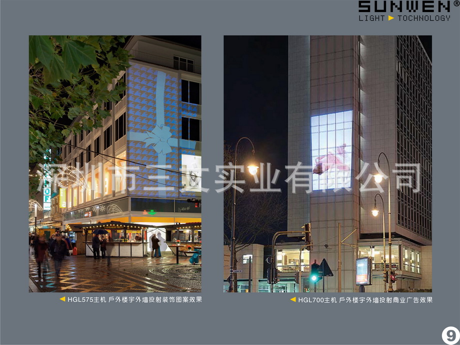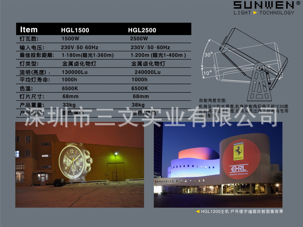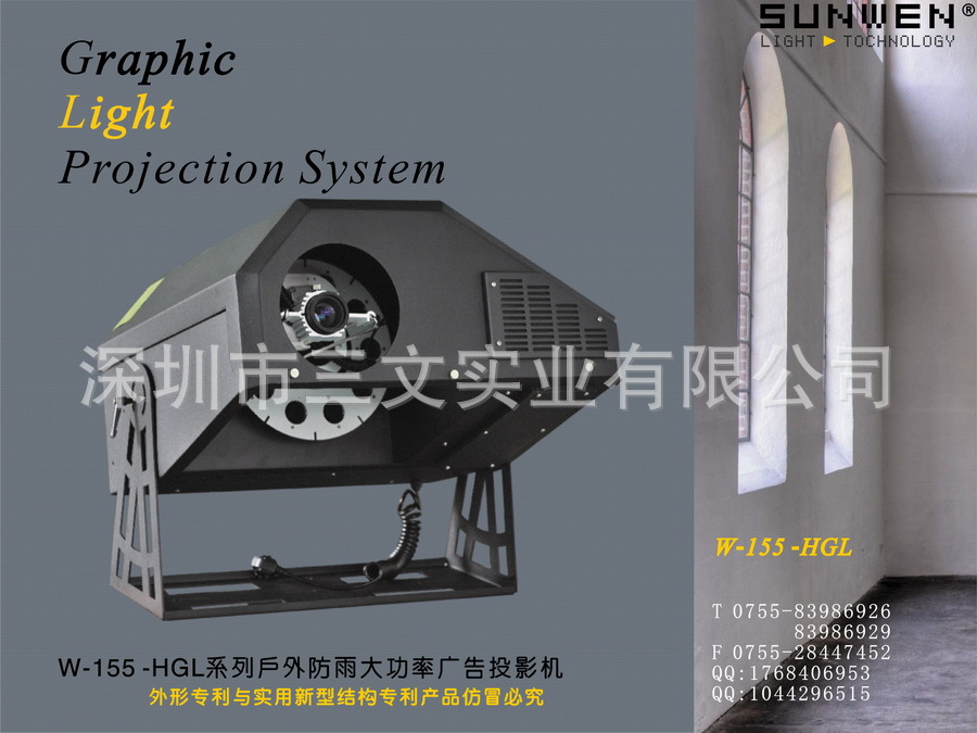 HGL户外防雨动态投影仪系列产品主要应用于室外环境。我们有可以在商店橱窗内使用的小型设备,也有可以打在户外楼面上的大型设备。W-155-GHL户外防雨动态投影仪设计用于特殊场合,特别是百货公司,专零售商、银行、酒店、展会展览、餐馆、博物馆、画廊影楼、电台、汽车4S店等特殊活动以及会客大厅等,我们公司的大型设备适用于体育竟技场,主题公园和户外广告场合。