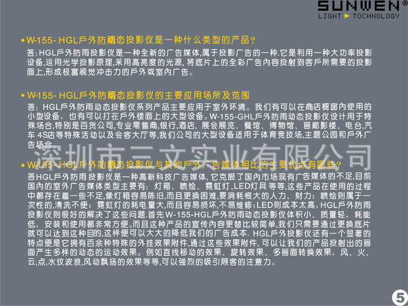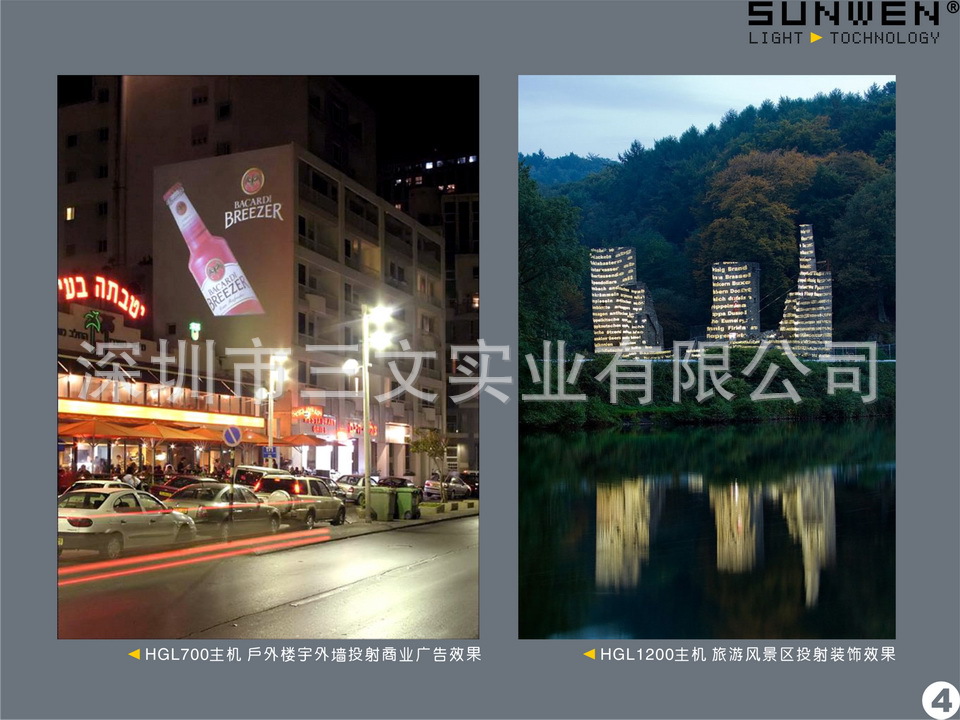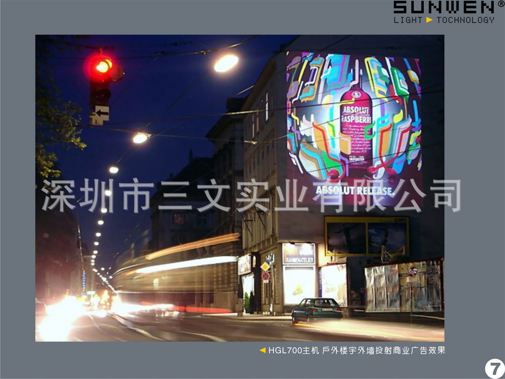 HGL户外防雨投影仪是一种高新科技广告媒体,它克服了国内市场现有广告媒体的不足,目前国内的室外广告媒体类型主要有:灯箱、喷绘、霓虹灯、LED灯具等等,这些产品在使用的过程中都存在着一些不足,像灯箱容易旧,而且更换困难,要消耗根大的人力、财力;喷绘则属于一次性的,清洗不便;霓虹灯的耗电量大,而且容易损坏,不易维修;LED则成本太高。HGL户外防雨投影仪则很好的解决了这此问题,首先W-155-HGL户外防雨动态投影仪体积小、质量轻、耗能低,安装和使用都非常方便。而且这种产品的宣传内容更替比较简单,我们只需要通过更换底片**可以达到这种目的,这样便可以大大的降低我们的广告成本。HGL户外投影仪还有一个显著的特点便是它拥有百佘种特殊的外挂效果附件:通过这此效果附件,可以让我们的产品投射出的画面产生多样的动态的运动效果。例如直线的效果、旋转效果、多画面转换效果,风、火云、点、水绞波浪,风动飘扬的效果等等,可以强烈的吸引顾客的注意力。