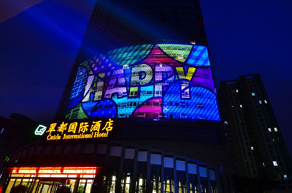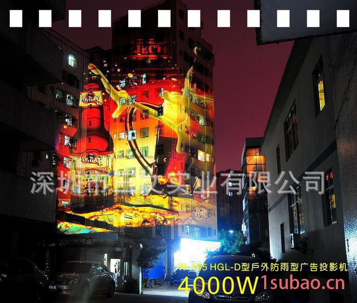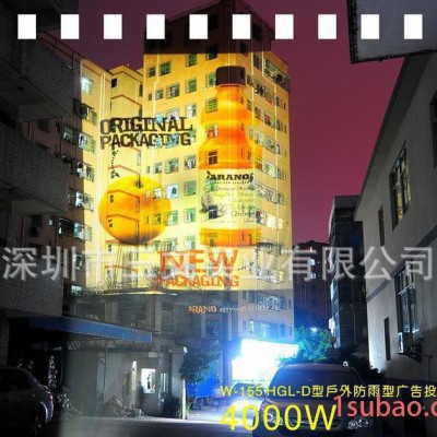 HGL户外防雨投影仪是一种全新的广告媒体,属于投影广告的一种。它是利用一种大功率投影设备,运用光学投影原理,采用高亮度的光源,将底片上的全彩广告内容投射到客户所需要的投影面上,形成极富视觉冲击力的户外或室内广告。