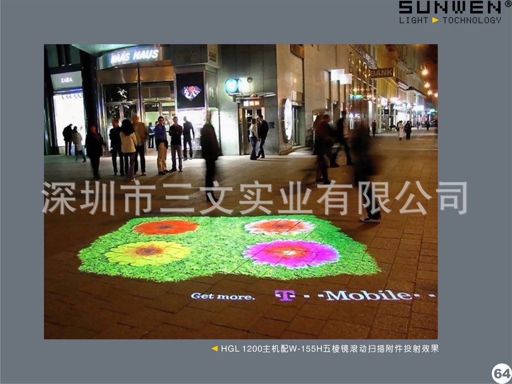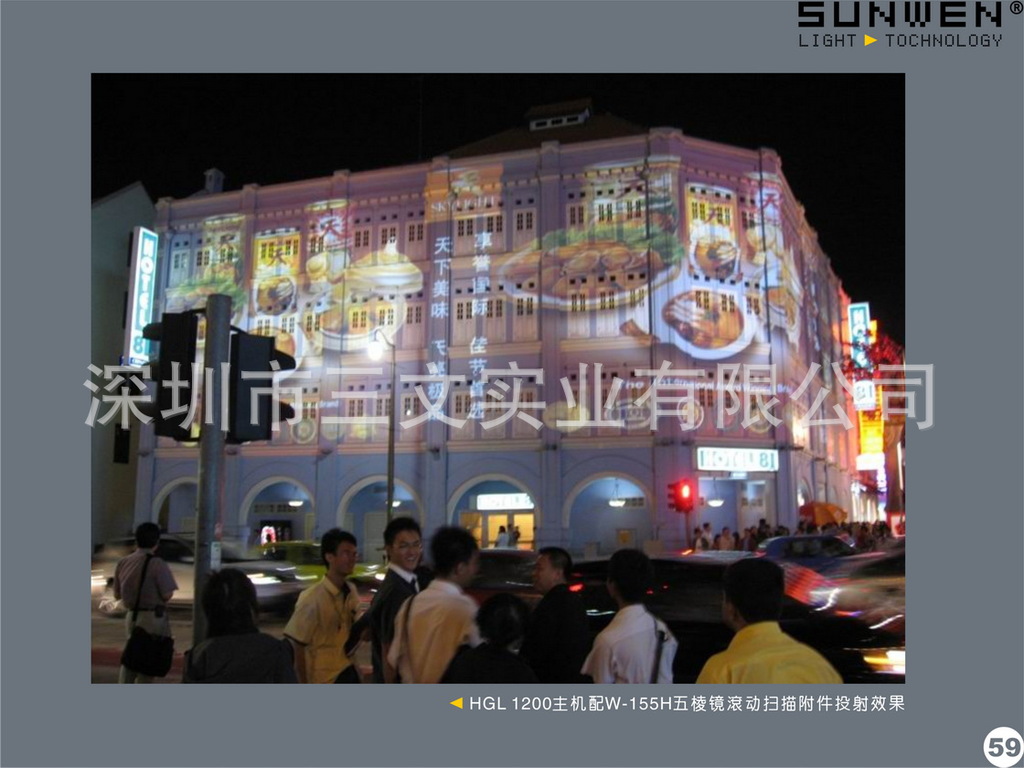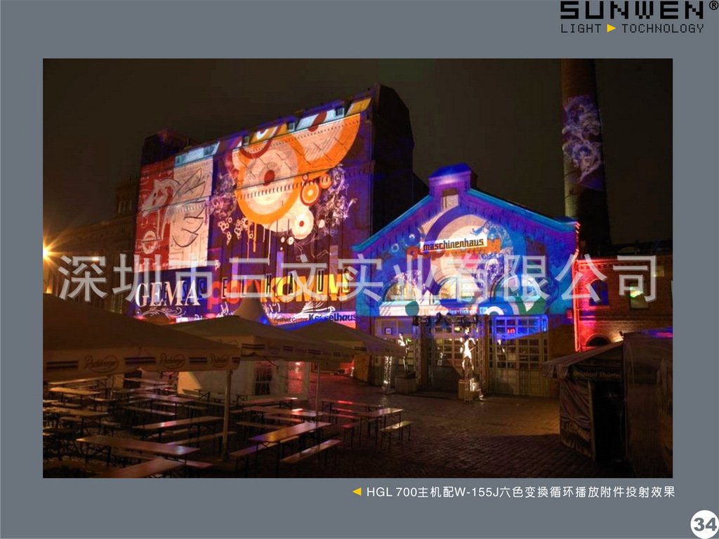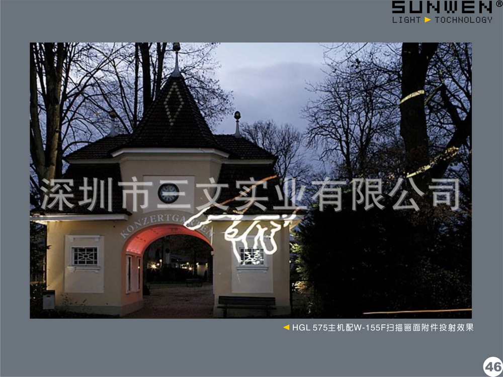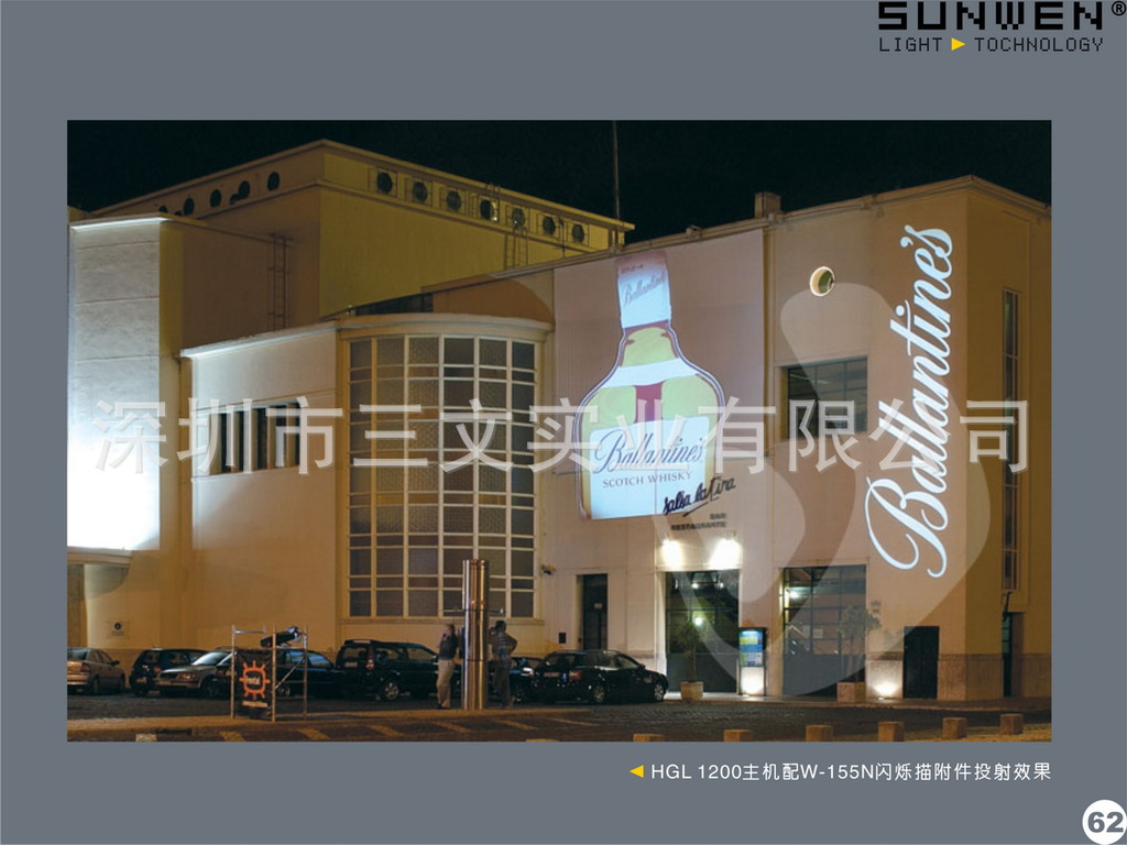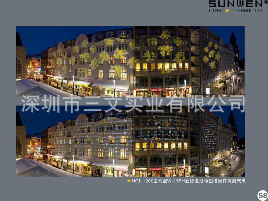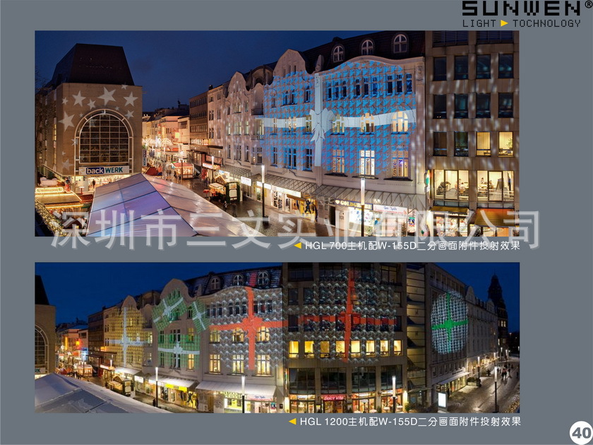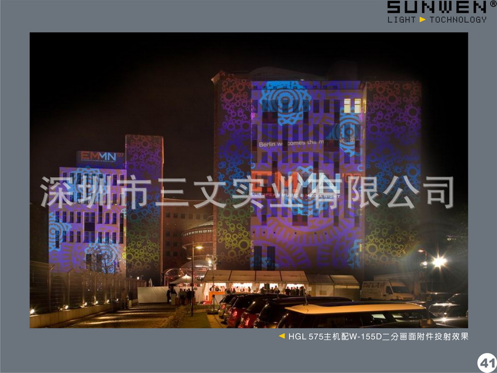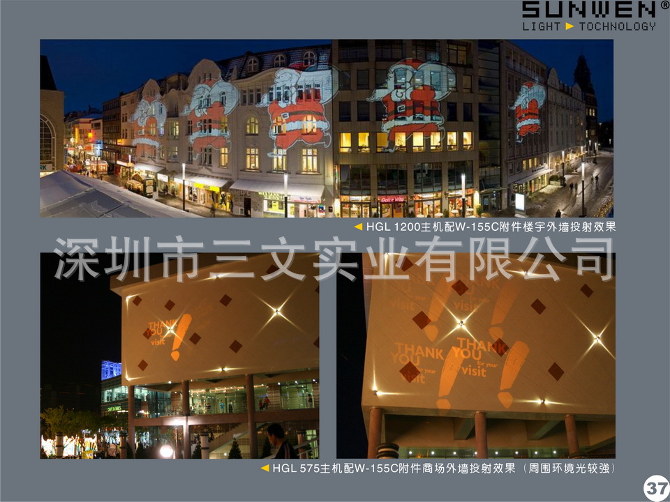 HGL户外防雨动态投影仪系列产品主要应用于室外环境。我们有可以在商店橱窗内使用的小型设备,也有可以打在户外楼面上的大型设备。W-155-GHL户外防雨动态投影仪设计用于特殊场合,特别是百货公司,专零售商、银行、酒店、展会展览、餐馆、博物馆、画廊影楼、电台、汽车4S店等特殊活动以及会客大厅等,我们公司的大型设备适用于体育竟技场,主题公园和户外广告场合。