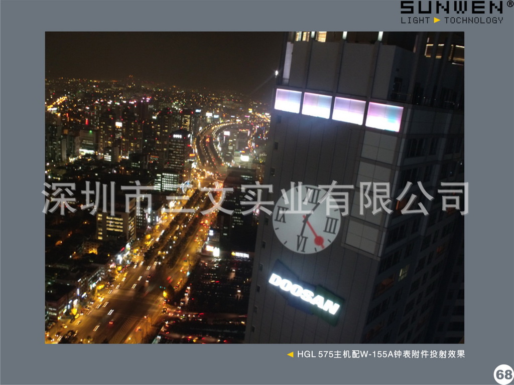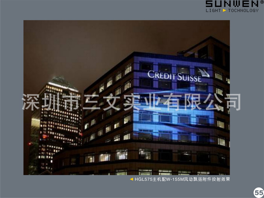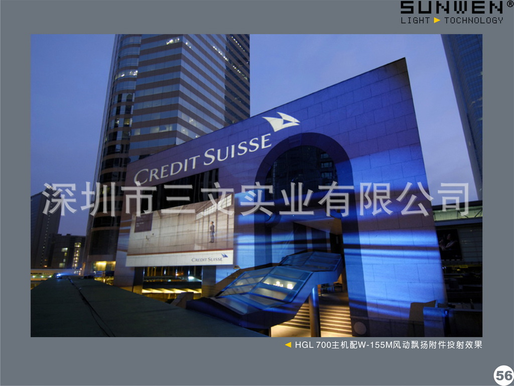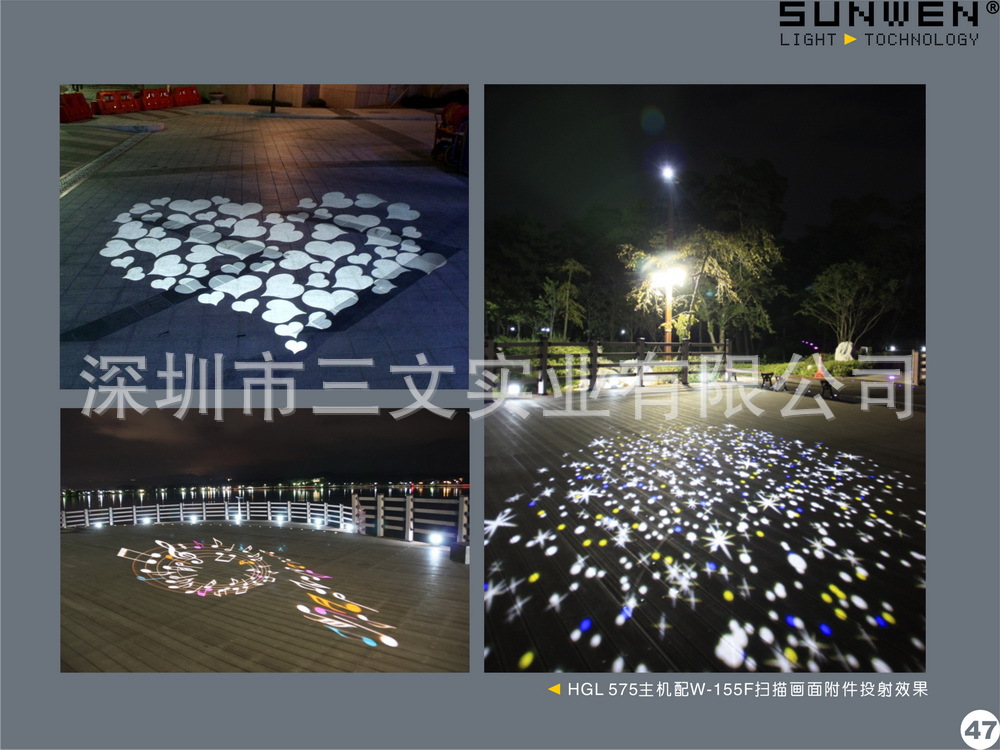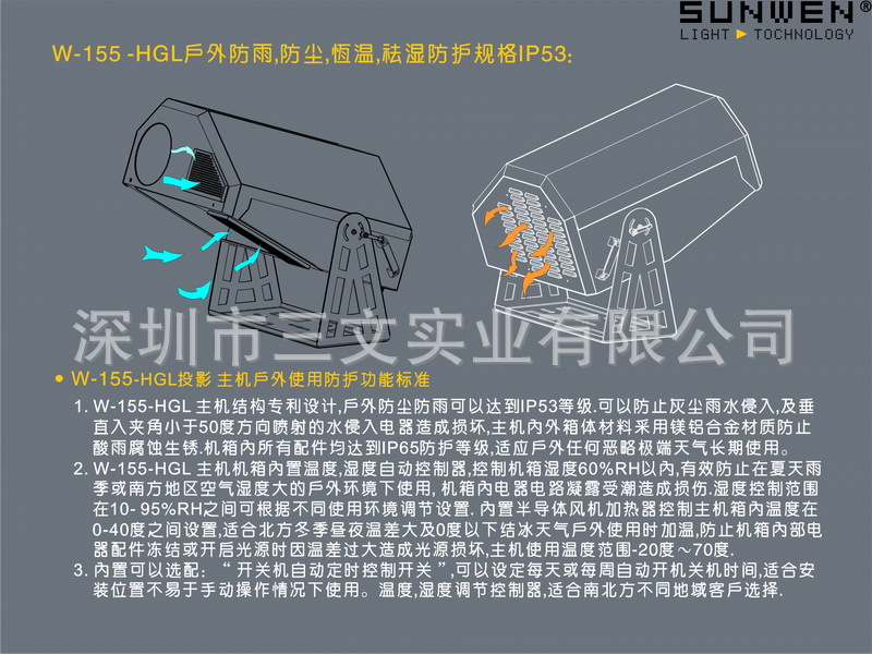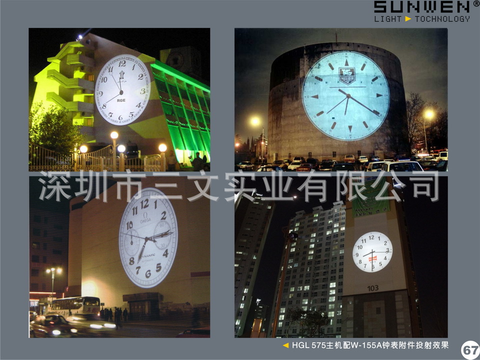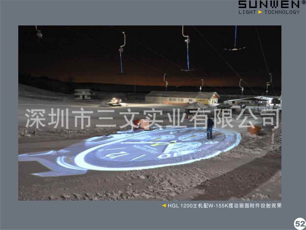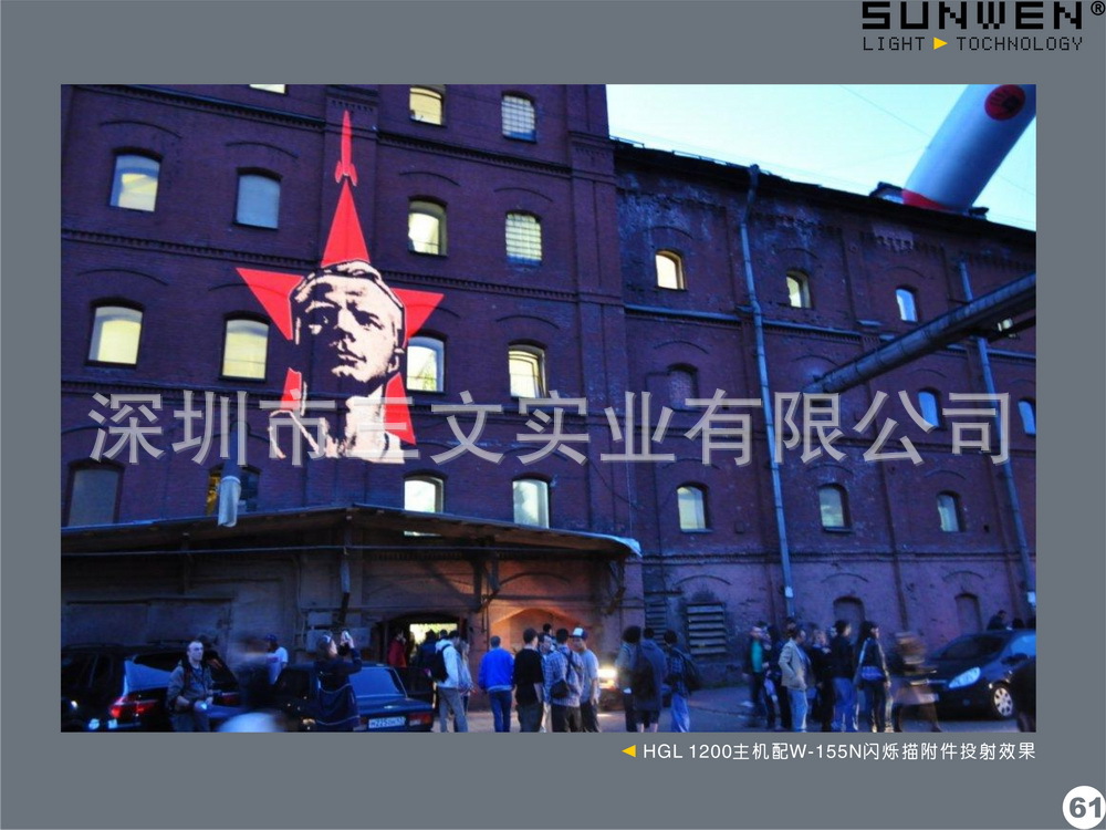 HGL户外防雨动态投影仪系列产品主要应用于室外环境。我们有可以在商店橱窗内使用的小型设备,也有可以打在户外楼面上的大型设备。W-155-GHL户外防雨动态投影仪设计用于特殊场合,特别是百货公司,专零售商、银行、酒店、展会展览、餐馆、博物馆、画廊影楼、电台、汽车4S店等特殊活动以及会客大厅等,我们公司的大型设备适用于体育竟技场,主题公园和户外广告场合。