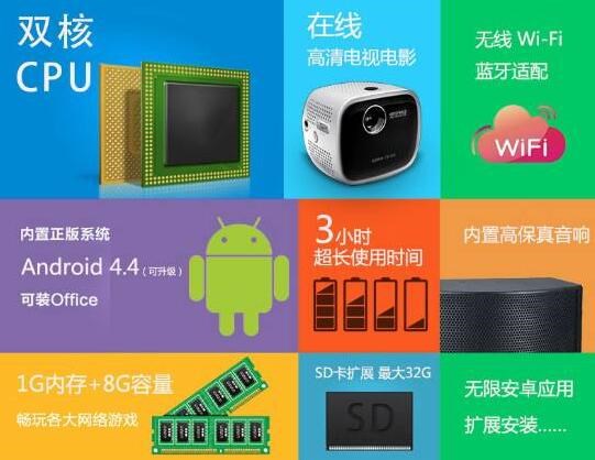 ①、微型智能投影仪开售以后,咨询、购机者甚多,大家问的**多的问题是能不能连接笔记本、手机等等,大家受传统投影仪的影响,以为投影仪**必须连接这些外设才能使用,这是个误区。所谓智能投影仪**是内置有操作系统的,本身**是一个小电脑,只不过屏幕需要投射出来而已,操作完全等同于安装有安卓系统的平板电脑。