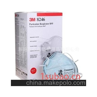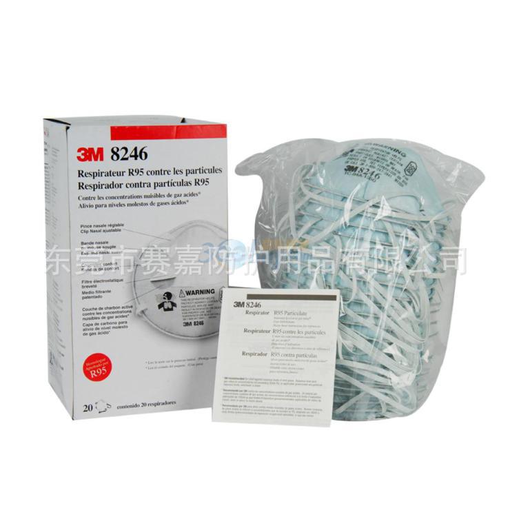 3M 8246 R95 酸性气体及颗粒物防护口罩(美国NIOSH标准)可用来防护非油性及含油性颗粒物,对含油性颗粒物有使用时间的限制(8小时),过滤效果最低可达95%(过滤效果以0.3微米的颗粒径作测试,流量为85升/分钟),8246用于颗粒物及微量酸性异味(例如二氧化硫、氯气、氟化氢等)的防护,用于化工,造纸、酿造、铝冶炼,玻璃制品等行业。