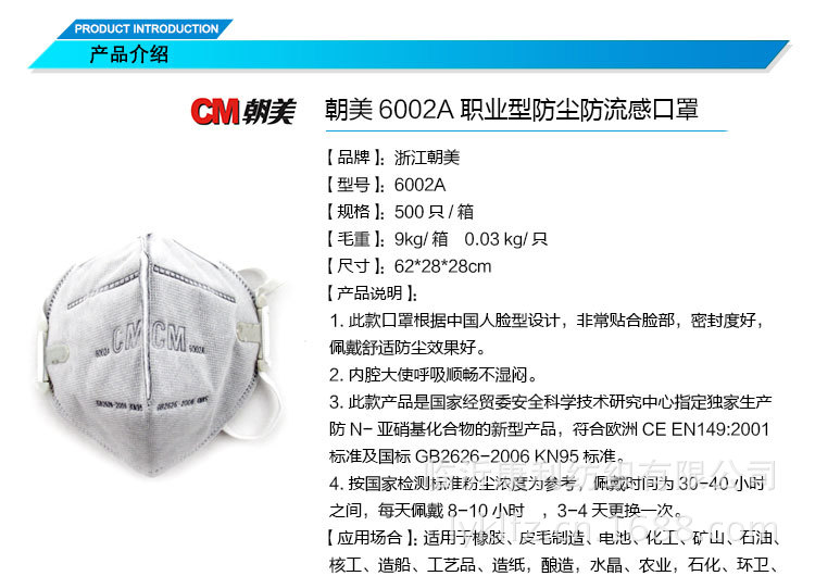 CM 朝美6002A活性炭防尘毒口罩 防喷漆异味 防甲醛 职业防护口罩