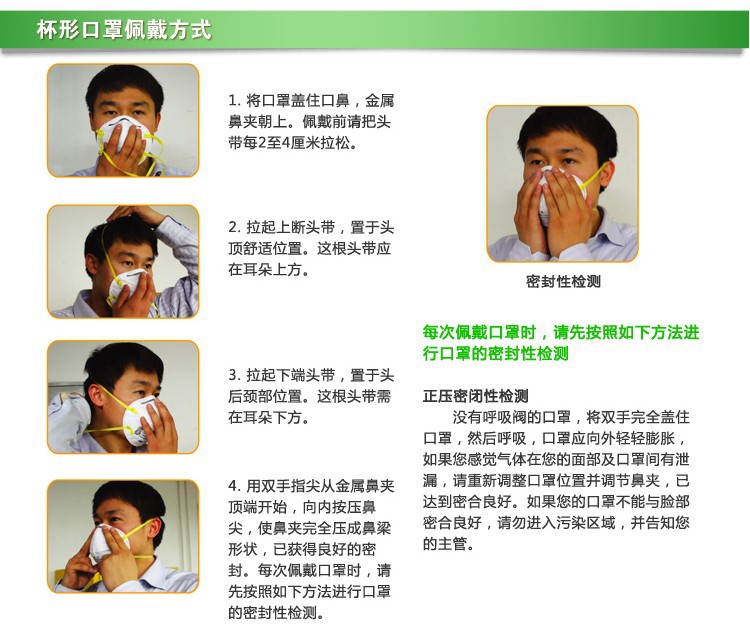 【使用说明】口罩可以使用到它破损、受血液或体液污染为止,或遵守当地的有关导则废弃。此外,口罩应储存在洁净的环境中,防止受到损坏、弄脏、接尘、阳光直射、高温和有害的化学物污染等,储存时还要避免是口罩变形。(备注:一般建议用1-2个星期左右,用的时间长了不卫生)