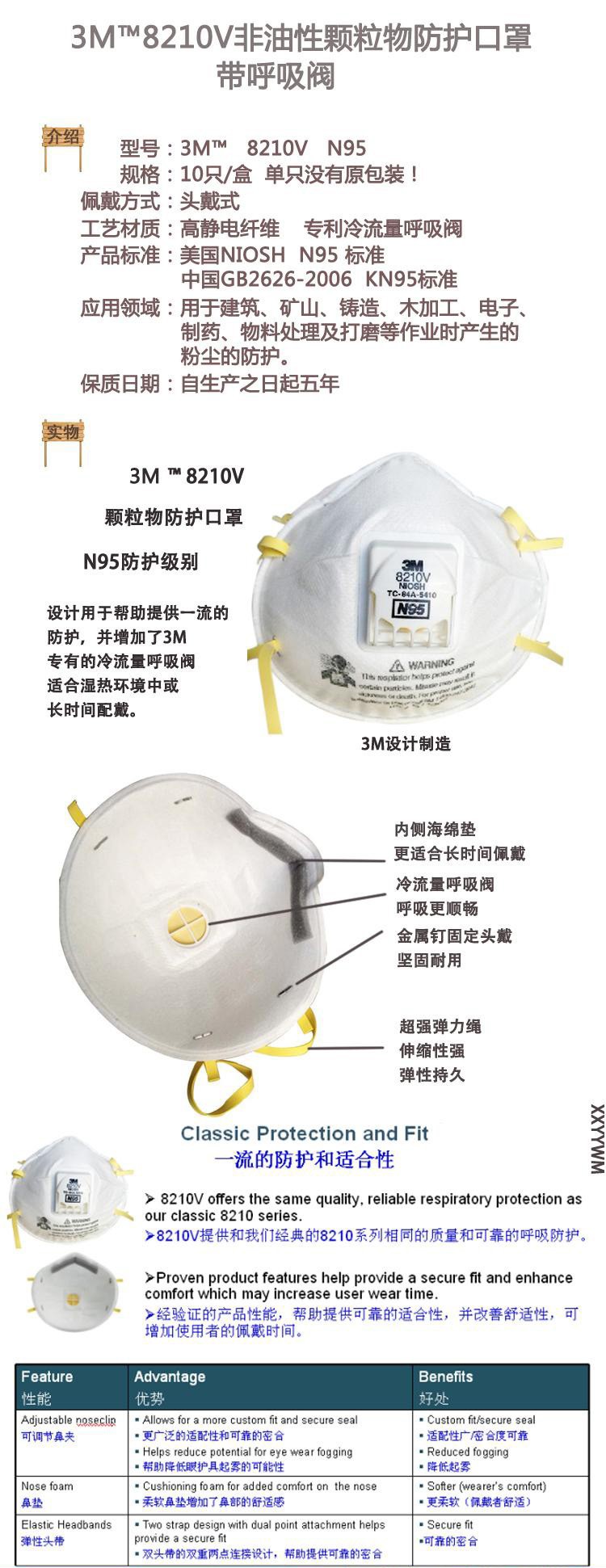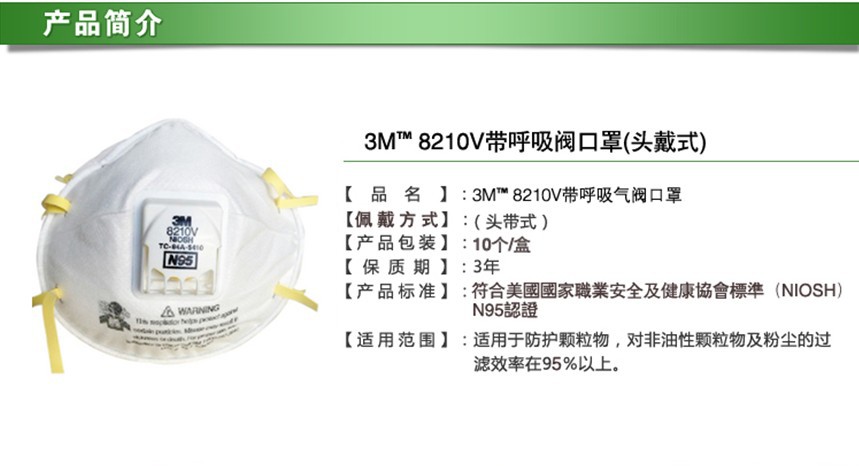 【用途】8210V N95防护口罩.适合建筑、石矿、纺织、打磨、五金铸造、制药、电子、制药、物料处理及打磨等作业时产生的粉尘的防护等行业。对流感 病毒 油性颗粒物流 沙尘暴有良好的防尘作用。