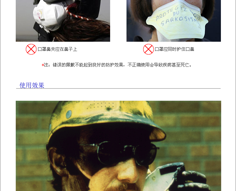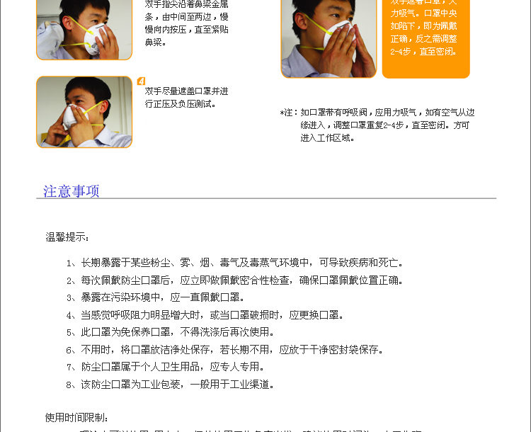 3.当口罩发生损坏或呼吸阻力过大时,请抛弃并更换新的口罩