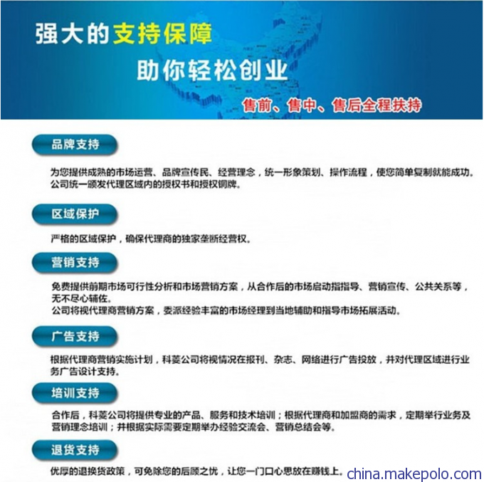 科菱净水机实行免费加盟政策,专营店年均收益37万/年;地区总代理年均收益80万/年,并且不包含滤芯更换带来的利润。 现公司对意向代理商实行招商经理一对一服务,请电至13318440160(招商部雷经理)或QQ咨询留下联系方式以便安排招商经理接洽。
