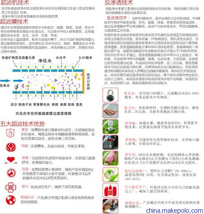 科菱公司有超滤净水器的涉水批件(批件号:卫水字(2011)第0129号)和反渗透RO机涉水批件(批准号粤卫水字(2013)第S1401号),每款产品都符合国家的要求,受到国家法律保护。市场上很多牌子的产品没有涉水批件或者只有其中一种产品的批件,目前国家在规范净水器,各地方政府已经在逐步严格管理净水器市场,遇到没有证件的净水器品牌,会高额罚款和没收处理,所以在选择代理时要首先合法经营,免得经济上遭受巨大损失。
