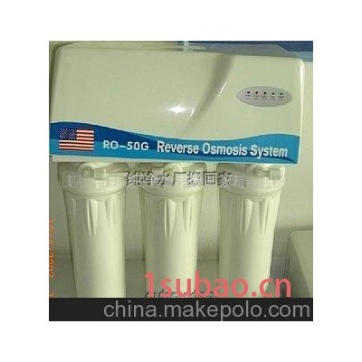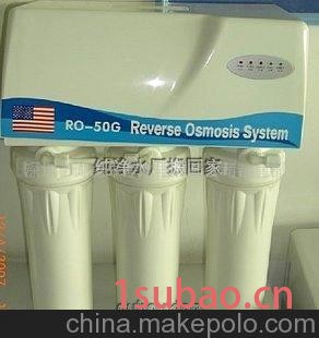 功能:利用超静压力泵产生高压渗透,使水分子和离子态的矿物质元素通过一层逆渗透膜,而溶解在水中的绝大部分重金属、有机物以及细菌、病毒等则无法透过逆渗透膜被截留(逆渗透膜上的孔径只有0.0001um,而病毒的直径一般有0.02-0.4um,普通细菌的直径有0.4-1um)