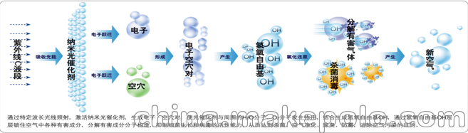 纳米光催化反应是因光子照射纳米钛后引起的。它又被称为光固体表面反应、光固体接口反应。 纳米钛吸收光氢离子发生管照射出的光子后,氧化钛内部生成电子与空穴,扩散到表面的电子与空穴能参与光催化反应,纳米钛表面能获得越多的电子与空穴,反应的效果越好。光氢离子净化段产生出强力氧化能力,与纳米钛表面起氧化反应后,生成氢氧自由基等多种强氧化性物质。