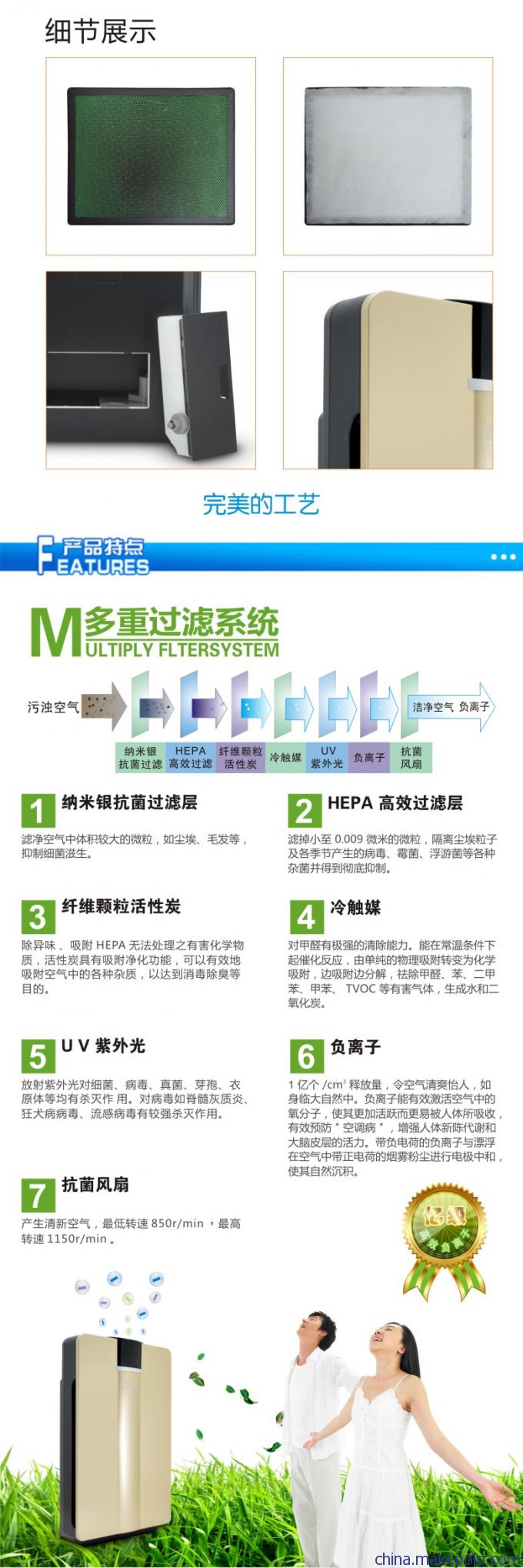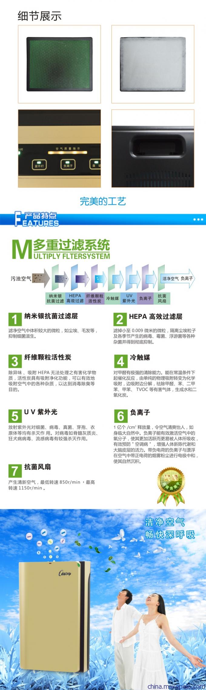 10、独有的前置过滤网层,UV紫外线、多元光触煤、负离子、光触煤、活性炭、HEPA过滤层、抗菌风扇,多重净化过滤,可以有效净化含有粉尘、病毒、细