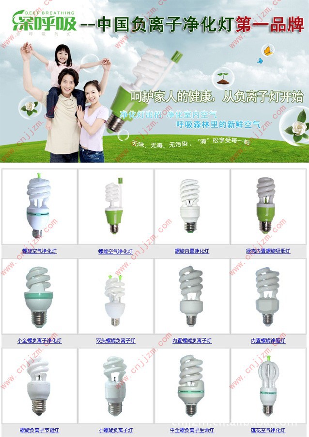 消烟:迅速消除空气中的烟雾,有效的预防"二手烟"对人身体的危害。负离子净化节能灯的问世,得到广大消费者的强烈欢迎与认可,受到国家照明部门的高度关注与好评,属于真正意义上的绿色环保产品,负离子被美誉为"空气维生素"。负离子节能灯——将光明与健康带进千家万户,必将成为未来照明世界中一颗璀璨的红星。