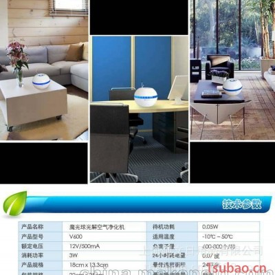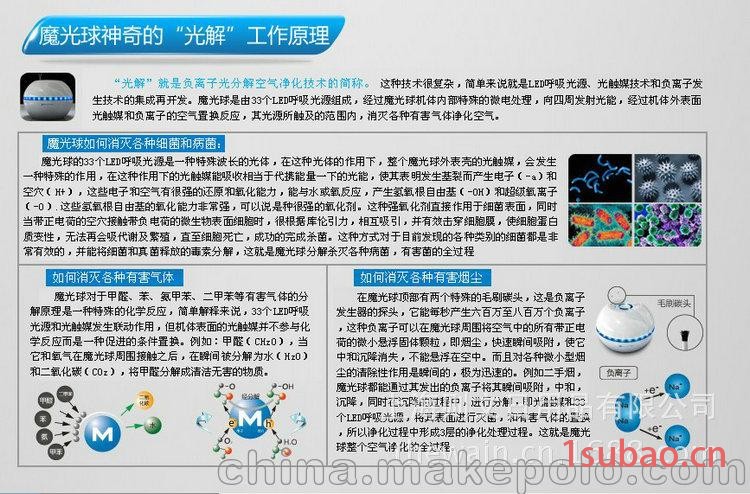 (2)如何消除有害空气:魔光球对于甲醛、苯、氨、甲苯、二甲苯等有害气体的分解原理是一种特殊的化学反应,简单解释来说,33个LED光源与光触媒发生联动作用,但机体表面的光触媒并不参与化学反应,而是一种促进的条件置换。例如:甲醛(CH2O),当它和氧气在魔光球周围接触之后,在瞬间杯分解为水(H2O)和二氧化碳(CO2),将甲醛分解成清洁无害的物质。