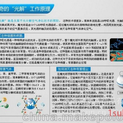 (1)“光解”就是负离子光分解空气净化技术的简称。简单来说就是LED呼吸光源、光触媒技术和负离子发生技术的集成再开发。魔光球是由33个LED呼吸光源组成,经过魔光球机体内部特殊的微电处理,向四周发射光能,经过机体外表面光触媒和负离子的空气置换反应,其光源所触及的范围内,消灭各种有害气体,净化空气。