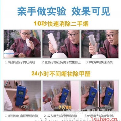 (4)如何消除烟尘:在魔光球顶部有两个特殊的毛刷碳头,这是负离子发生器的探头,它能每秒产生六百万至八百万个负离子,这种负离子可以再魔光球周围将空气中的所有带正电的微小悬浮固体颗粒,即烟尘,快速瞬间吸附,使它中和沉降消失,不能漂浮在空中。而且对各种微小型烟尘的清除作用是瞬间的,极为迅速的。例如二手烟,魔光球都能通过其发出的负离子将其瞬间吸附,中和,沉降,同时在沉降的过程中,进行光分解,即光触媒和33个LED呼吸光源,将其表面进行灭菌,和有害气体的置换,所以净化过程中形成3层的净化处理结果。这就是魔光球整个空气净化的全过程。