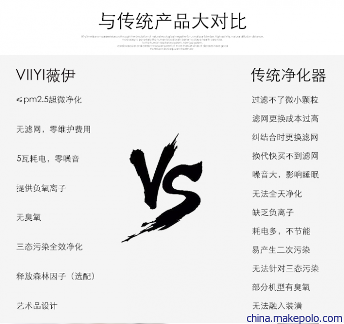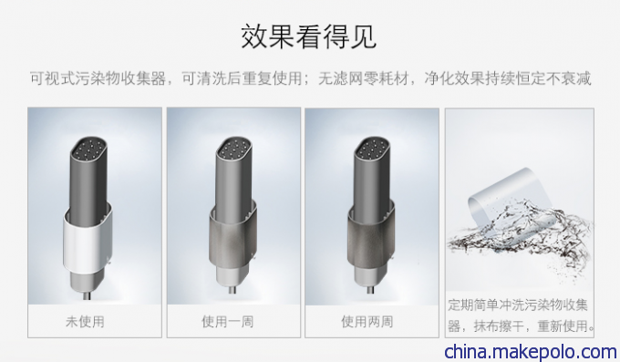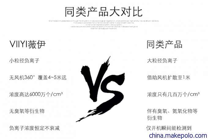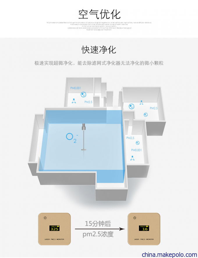按照世界卫生组织的标准,空气中负离子浓度达到每立方厘米1000-1500个为洁净空气。薇伊运用独有生态负离子生成芯片专利技术(Ecological anion chip)为空间提供空气维生素——负氧离子。生态级负氧离子主动出击结合空气中尘埃粒子及固体颗粒,使颗粒荷电产生聚合作用,形成较大颗粒而沉降,超细颗粒物(PM0.1)与负离子结合带上负电后,被带有正电的污染物收集器吸引收集,快速达到高效净化目的。