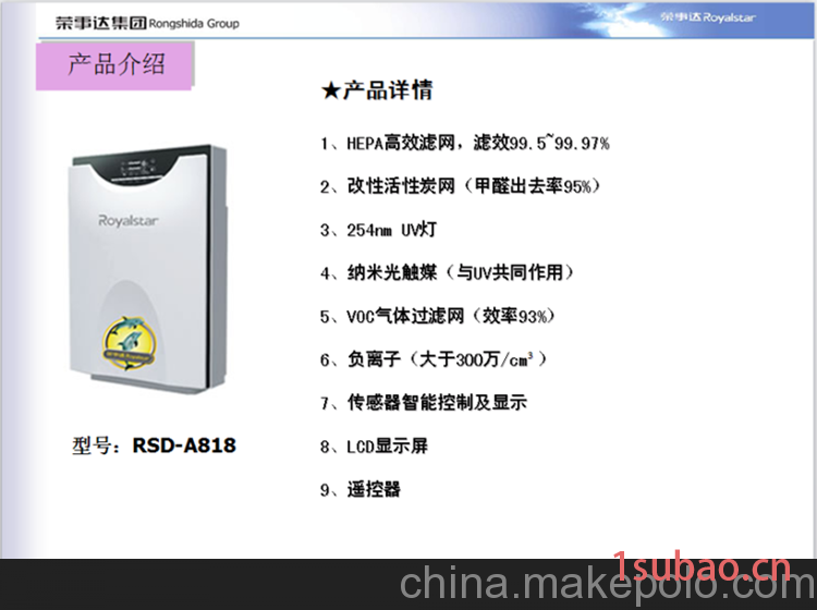 本网页所展示的有关【供应荣事达RSD-A818空气净化器_空气净化器_北京华湘恒升商贸有限公司】的信息/图片/参数等由简塑制品网的会员【北京华湘恒升商贸有限公司】提供,由简塑制品网会员【北京华湘恒升商贸有限公司】自行对信息/图片/参数等的真实性、准确性和合法性负责,本平台(本网站)仅提供展示服务,请谨慎交易,因交易而产生的法律关系及法律纠纷由您自行协商解决,本平台(本网站)对此不承担任何责任。您在本网页可以浏览【供应荣事达RSD-A818空气净化器_空气净化器_北京华湘恒升商贸有限公司】有关的信息/图片/价格等及提供【供应荣事达RSD-A818空气净化器_空气净化器_北京华湘恒升商贸有限公司】的商家公司简介、联系方式等信息。