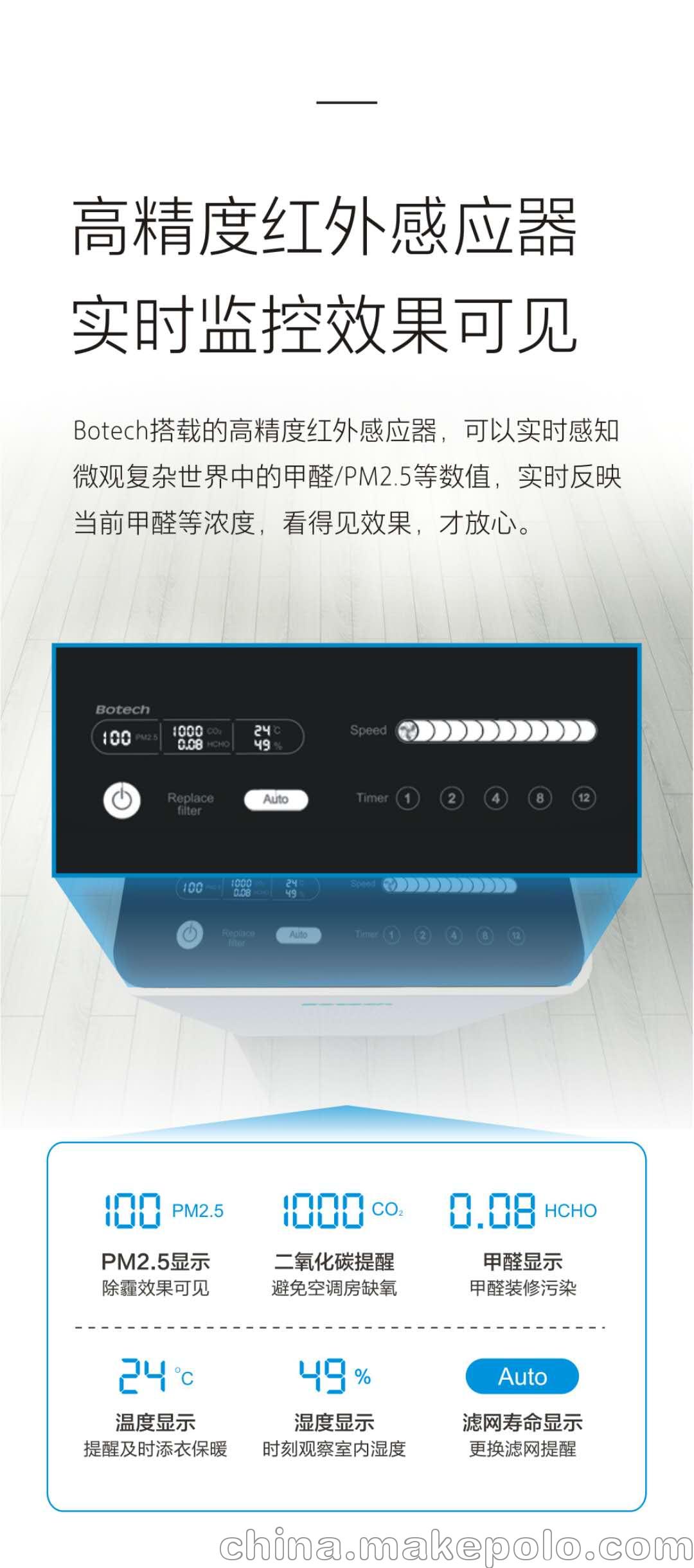 5.大显示电容触屏,多项空气质量参数实时显示,空气净化看得见。