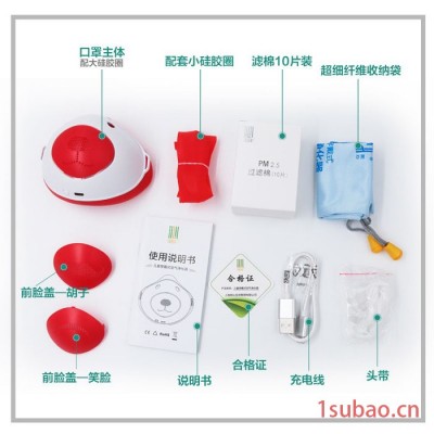 包装内含一盒滤棉、两个不同大小硅胶圈、三个不同图案前脸盖、两根头带、一个收纳布袋、一根充电线、一本说明书