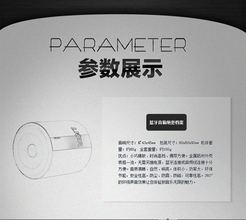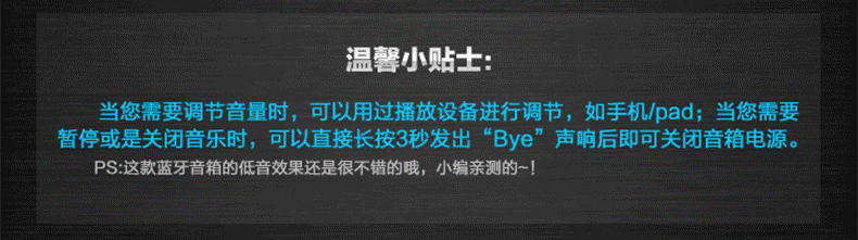 ***规格型号: 连接方式:蓝牙连接 音频接口:3.5mm插头 阻抗:4Ω 电压范围:DC3.0-5.5V 输出功率:3W 音频带宽:20~20000HZ 灵敏度:110dB 信噪比:≥100dB 失真度:≤1% 机内电池:聚合物充电电芯 音箱尺寸:43mm*45mm