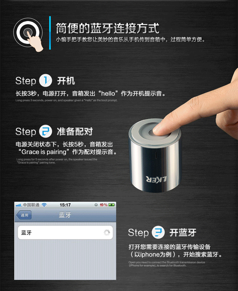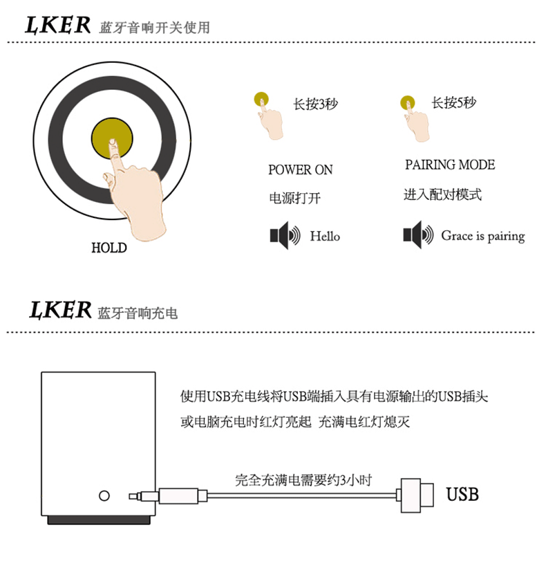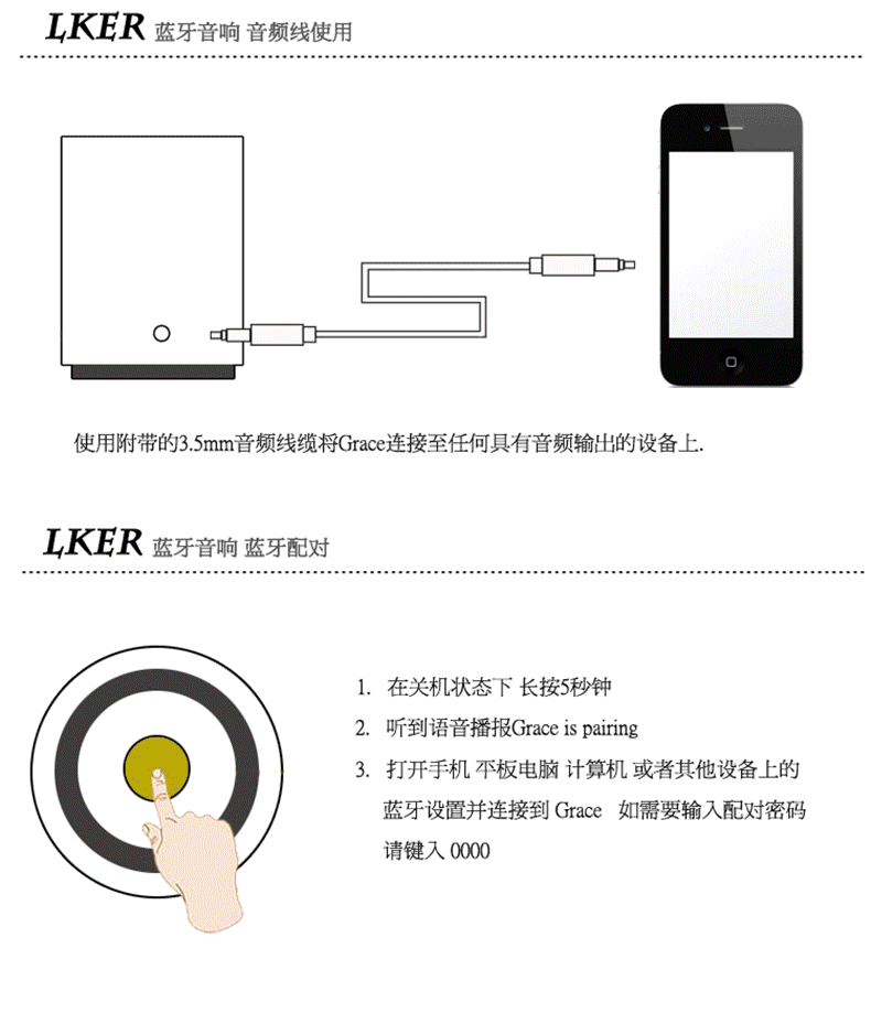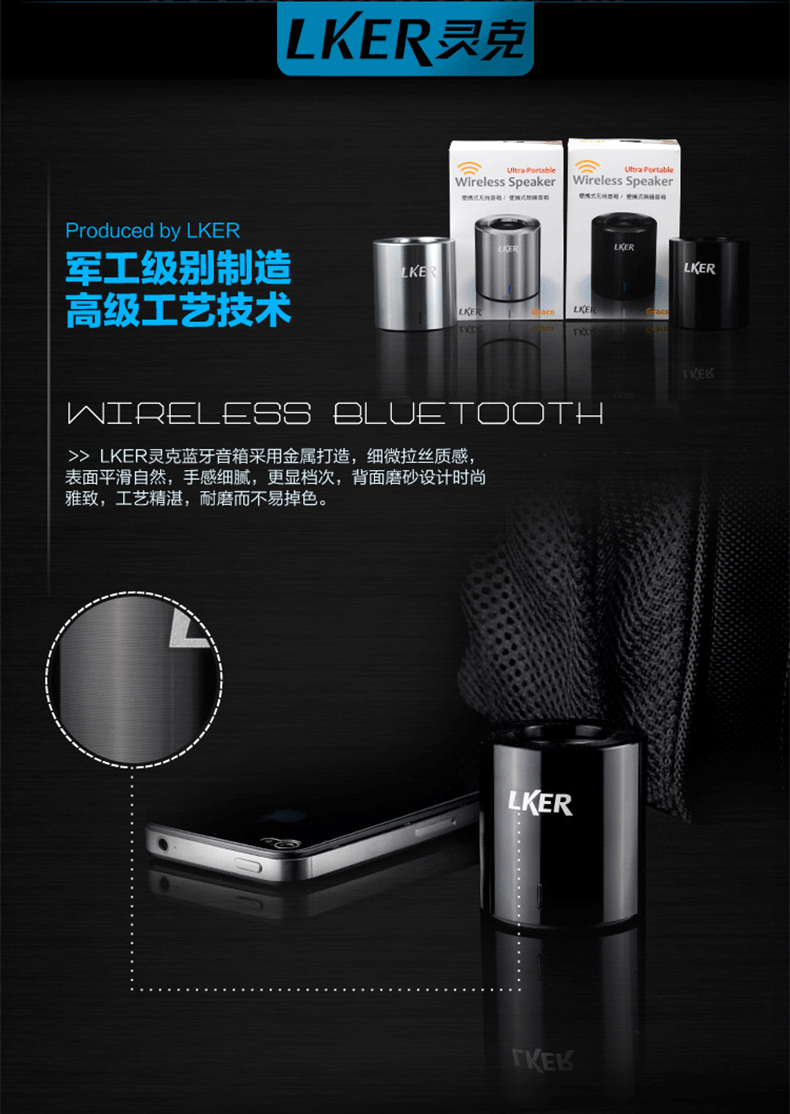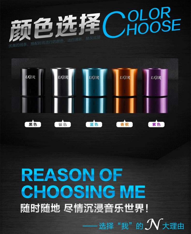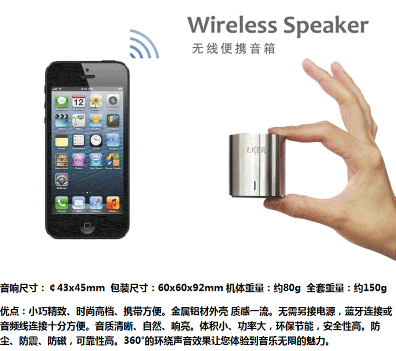 请咨询客服根据需要选择! LKER灵克Grace蓝牙音箱 原装** ***灵克优点: 兼容性:兼容市场上**的蓝牙设备,连接快,抗干扰强。 便携:小巧精致、时尚高端、携带方便。 无需另接电源,蓝牙连接或者音频线连接,十分方便。 材质:金属铝材外壳,质感**。 音质:音质清晰、自然、响亮。 体积小、功率大,节能环保,安全性高。 防尘、防震、防磁,可靠性高。 360°环绕声音效果让您体验到音乐的无限魅力。