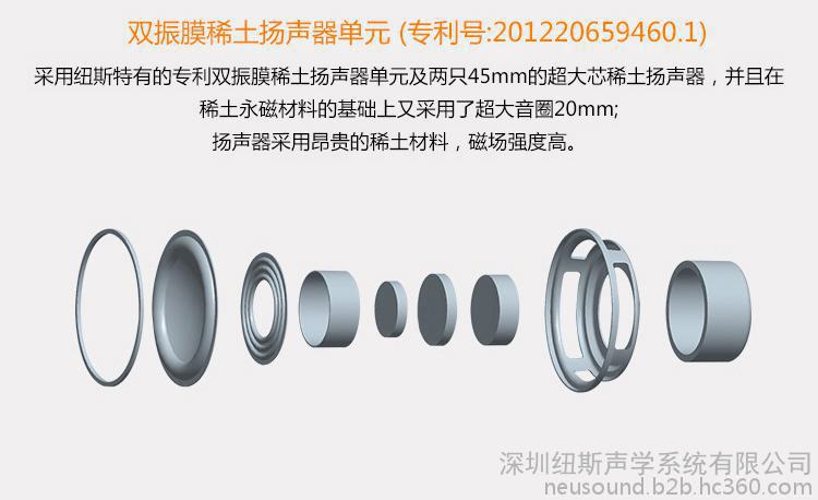 双振膜稀土扬声器单元(**号:201220659460.1),超大芯(20mm )稀土扬声器,低音厚重,中高音清澈;