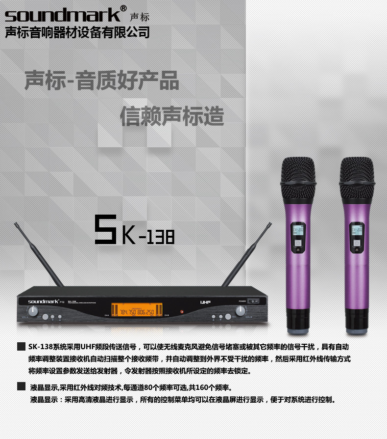 SK-138系统采用UHF频段传送信号,可以使无线麦克风避免信号堵塞或被其它频率的信号干扰,具有自动频率调整装置接收机自动扫描整个接收频带,并自动调整到外界不受干扰的频率,然后采用红外线传输方式将频率设置参数发送给发射器,令发射器按照接收机所设定的频率去锁定。