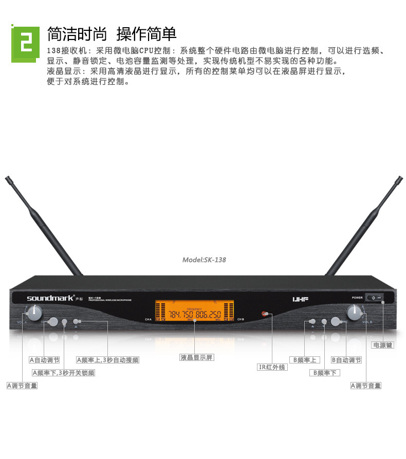 高清液晶显示,采用红外线对频技术,每通道80个频率可选,共160个频率。