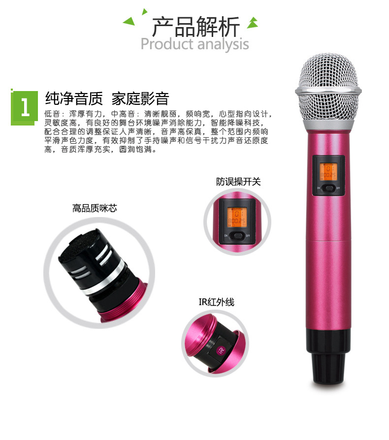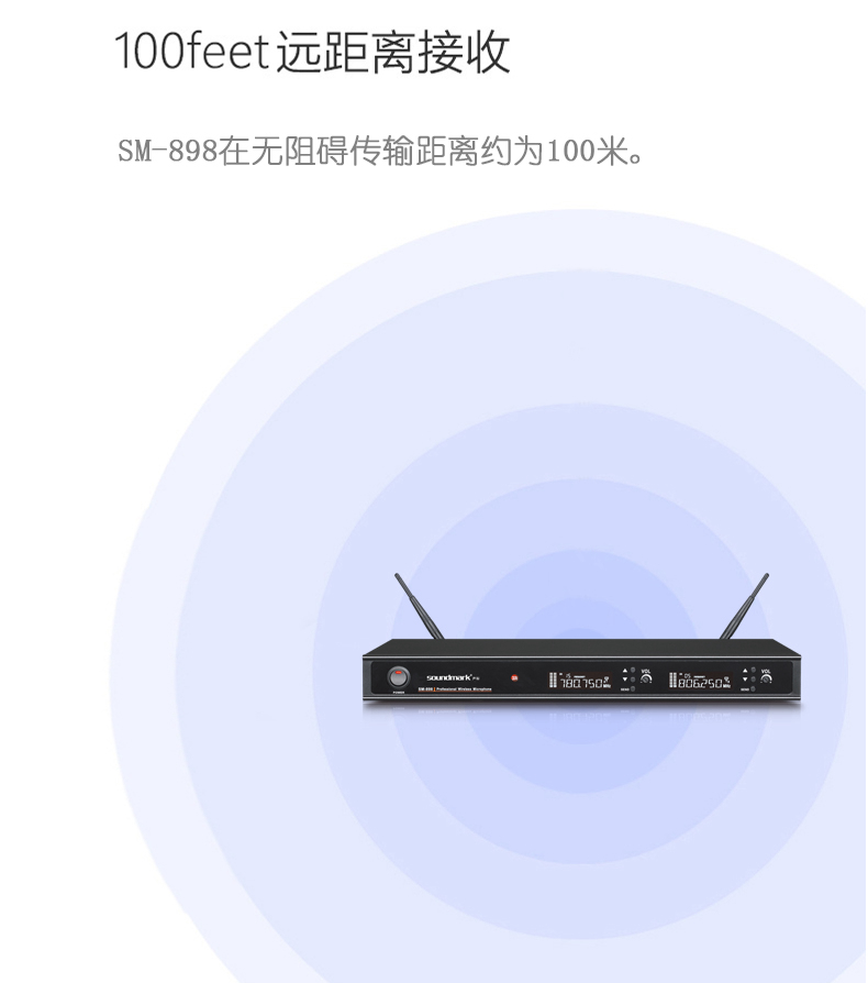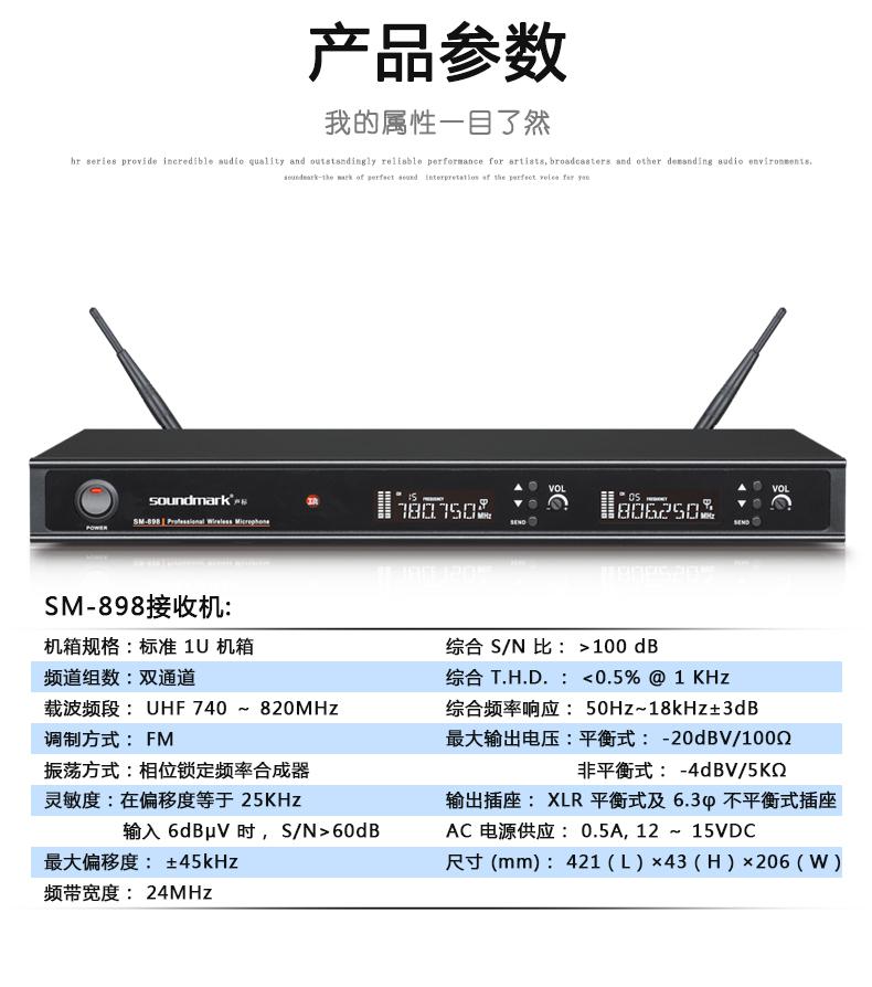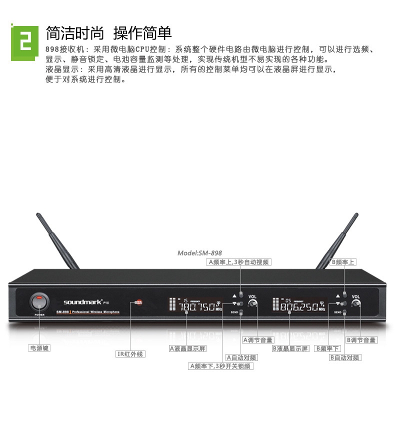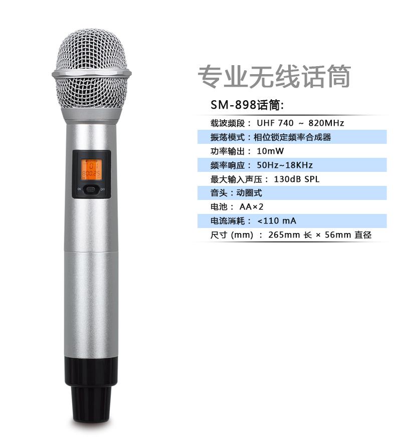 SM-898无线话筒系统是一款适合舞台演唱用的无线话筒系统,采用众多技术设计于一身:高频段(UHF)传输、真正分集式接收、双CPU控制、液晶显示、金属外壳,PLL锁相环技术、杂讯检测等,具有160个频点可调、易于操作的优点。