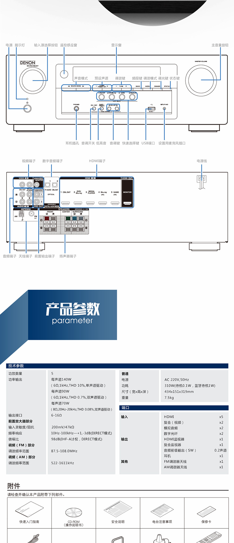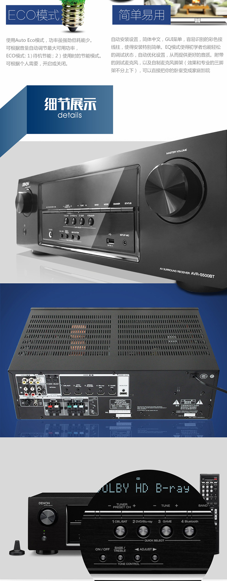 构建在多年来广受欢迎的Denon AV系列的基础上,AVR-S500BT 5.2 AV接收机以非常实惠的价格提供**的环绕声技术。无论您是看电影还是玩电子游戏,能输出140W功率的5个声道给您带来具有真实冲击力的环绕声。即使你是使用2声道收听**喜欢的立体声音乐,其性能也很出色。蓝牙能方便地从您的移动电话及其他兼容便携式设备进行无线播放。而储存在您手机中的音乐,也可以从手机播放音乐串流服务。清晰的屏上显示、自动设置和房间EQ使本接收机便于设置和使用。四个“快速选择”按钮能即时访问您**喜欢的音源,还可用于储存您的**设置。