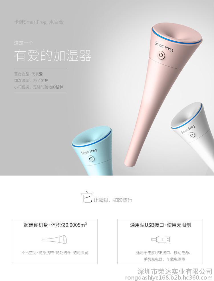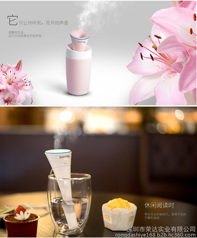 2016年卡蛙新款水百合微孔加湿器,出雾均匀细腻,超静音。外观时尚精致,采用低压5v直流USB供电,办公,车载,家用均可!产品做工精致,质量可靠,且价格低廉,是礼品,外贸,零售**,诚邀您洽谈合作!